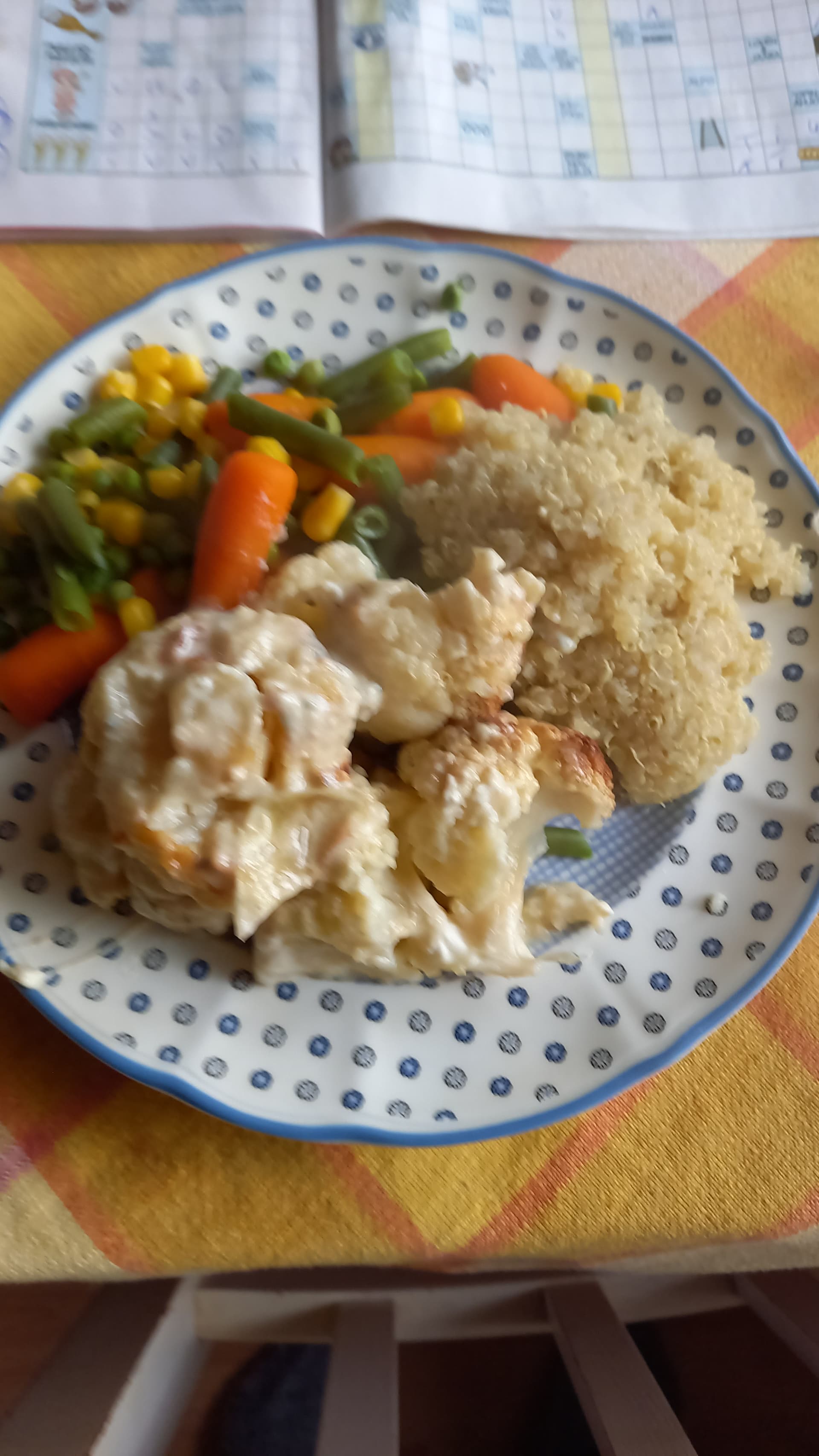 Siinä on pakastevihannesta, kvinoa ja kukkakaalia enkä jaksanut kaikkia syödä.