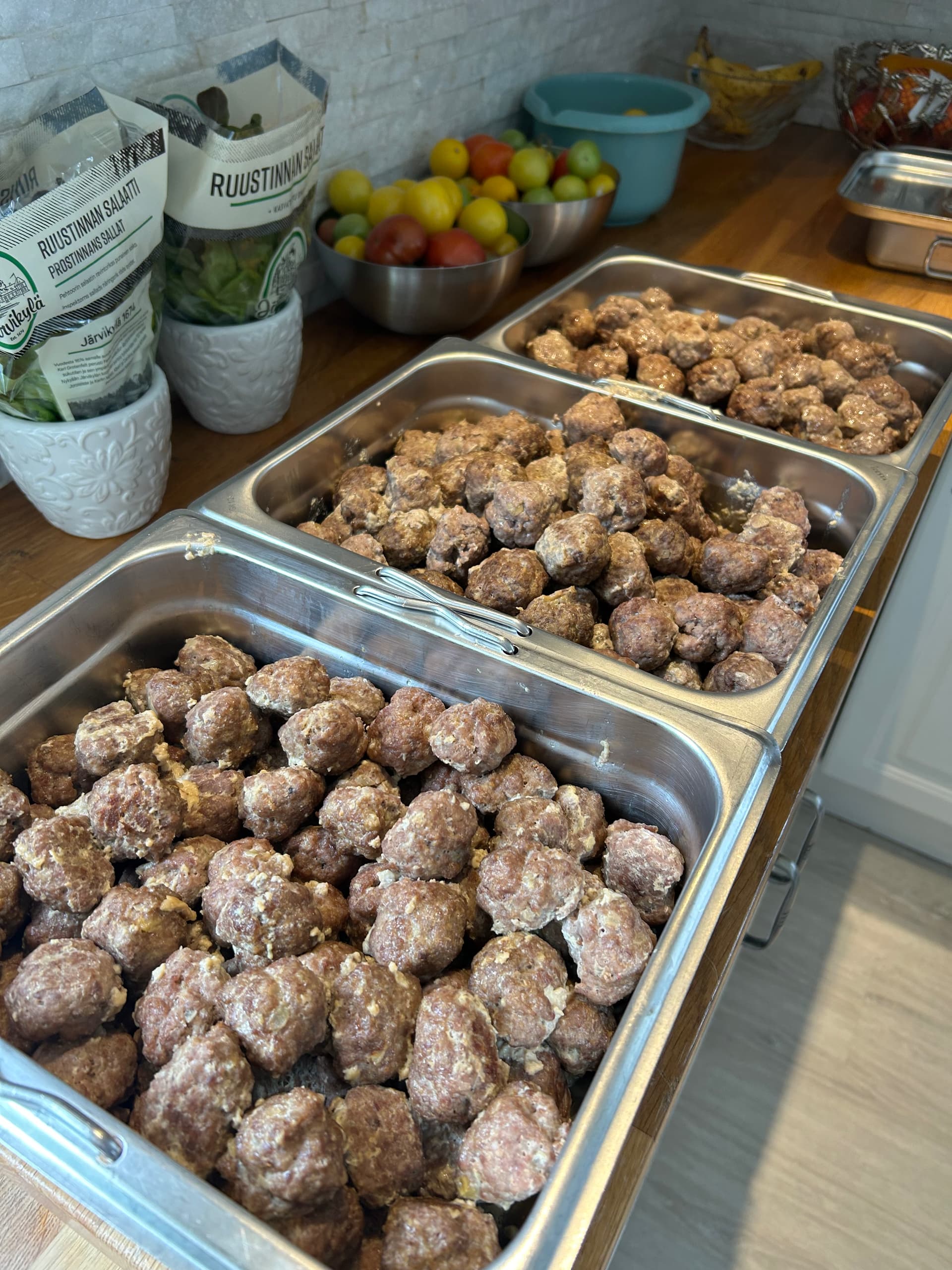 Hirvenlihapullia miehen pojan häihin, jotka on lauantaina. Laitoin sekaan vähän possua, ettei ole niin kuivaa.