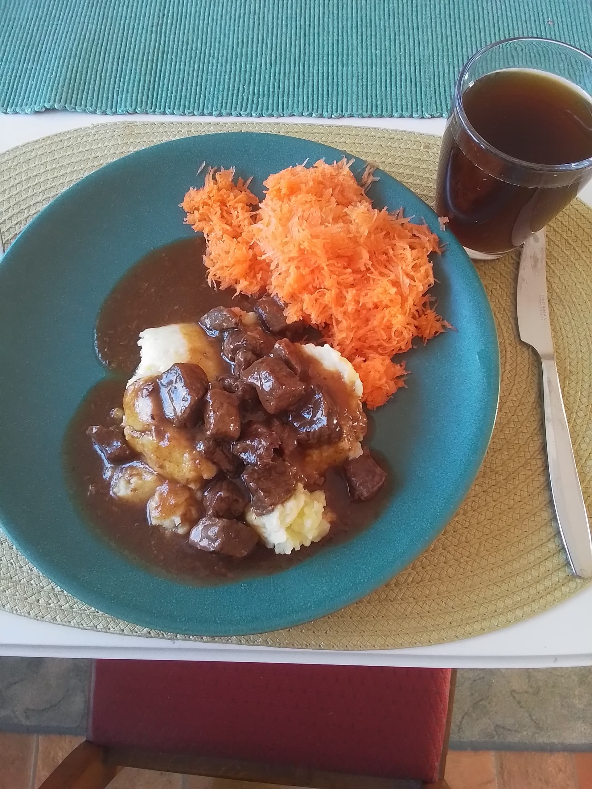 Keitetyt perunat ja porkkanaraasteella höystettyä jauhelihakastiketta omaan tomaattikastikkeeseen tehtynä. Pitää yrittää käyttää niitä omia säilykkeitä ettei jää perinnöksi lapselle ![]()