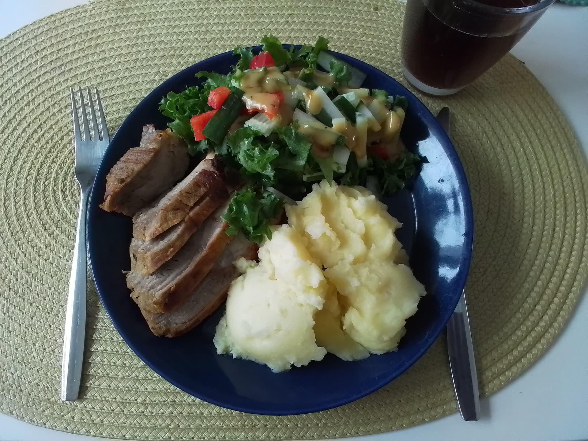 Lihapullia, kermaperunat, uunijuureksia ja salaatti.