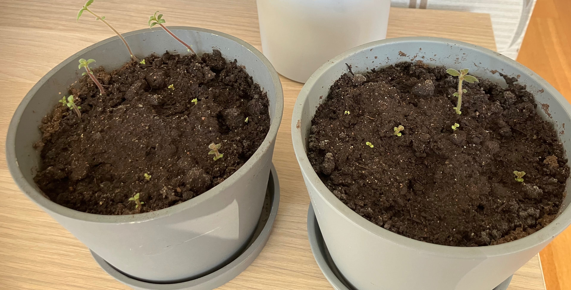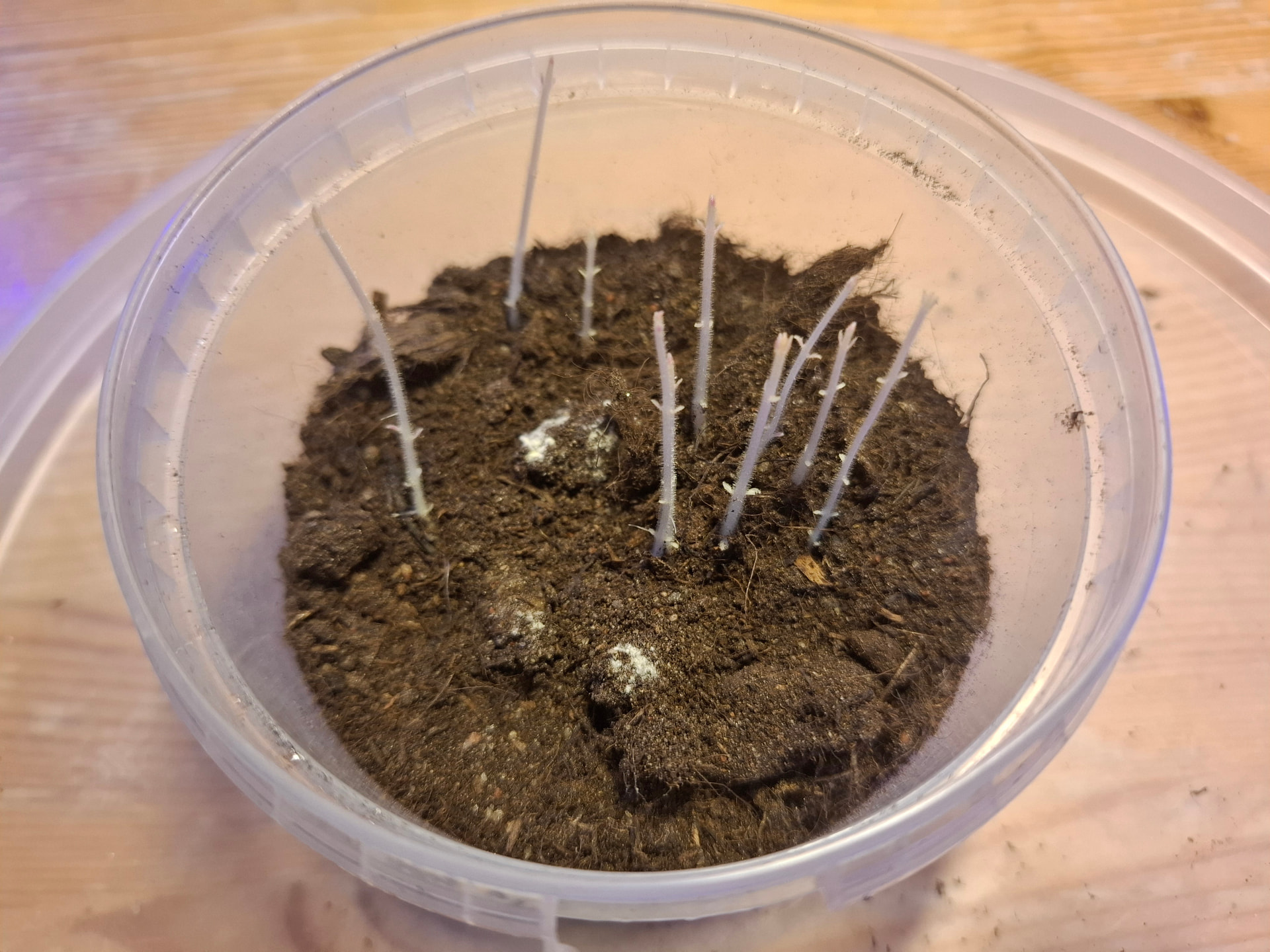 Tuo oli se purkki missä säilytin ne aika kuivassa kukkamullassa ja ne oli siellä alkaneet itää. Kippasin purkin ja istutin jokaisen kävyn omaan taimipurkkiin, niin että latvat oli just mullan pinnalla eli kävyt on 2-3 cm mullan alla.