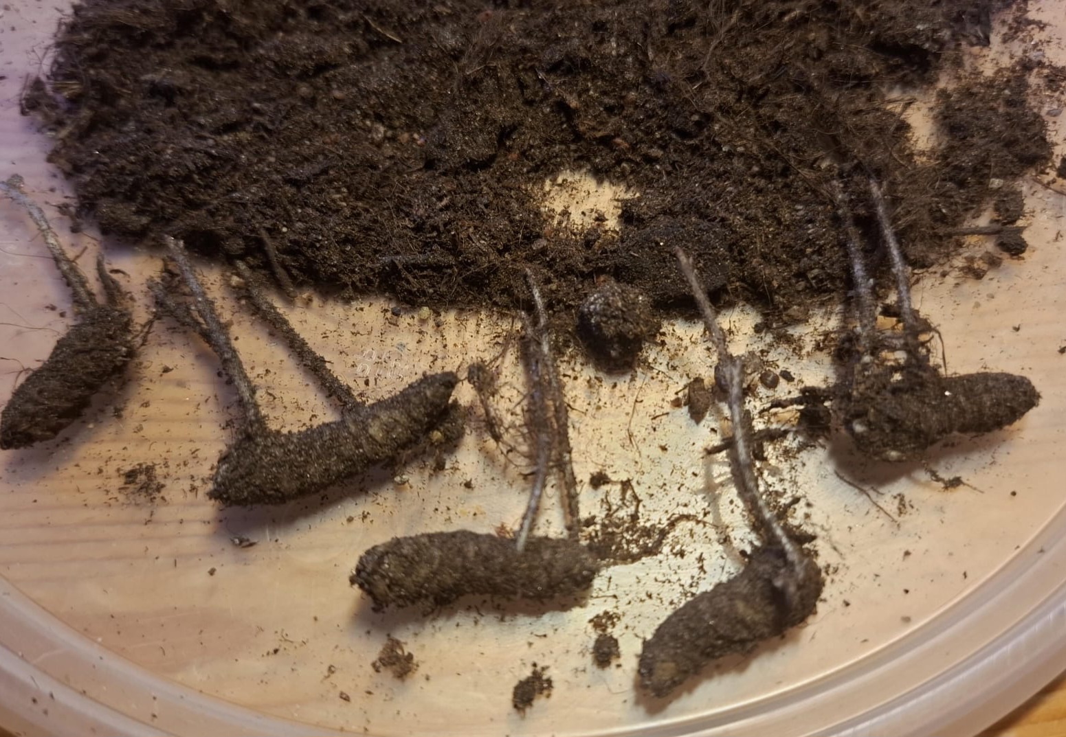 Kurkkasin käpypussukoihin ja kauhistuin. Olivat pirulaiset jo heräilleet ja kasvattaneet pitkiä siippoja. Hätäpäissäni laitoin ne nyt multiin vähän tavallista syvemmälle ja nyt sitten jännitetään kuinka käy