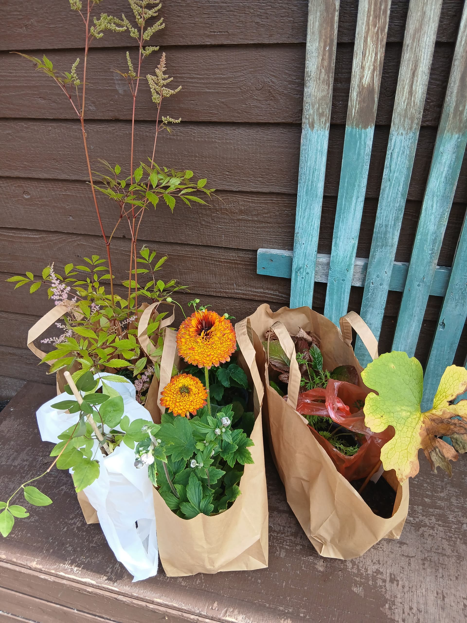 Ostin pari jaloangervoa. Yhden sormivaleangervon. Pari syysvuokkoa, yhden kylmänkukan. Kerrotun lumikin. Valkean kärhön. Tosi kerrotun kesäpäivänhatun.