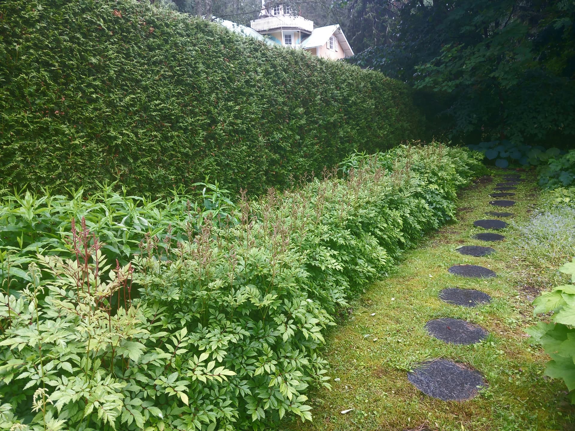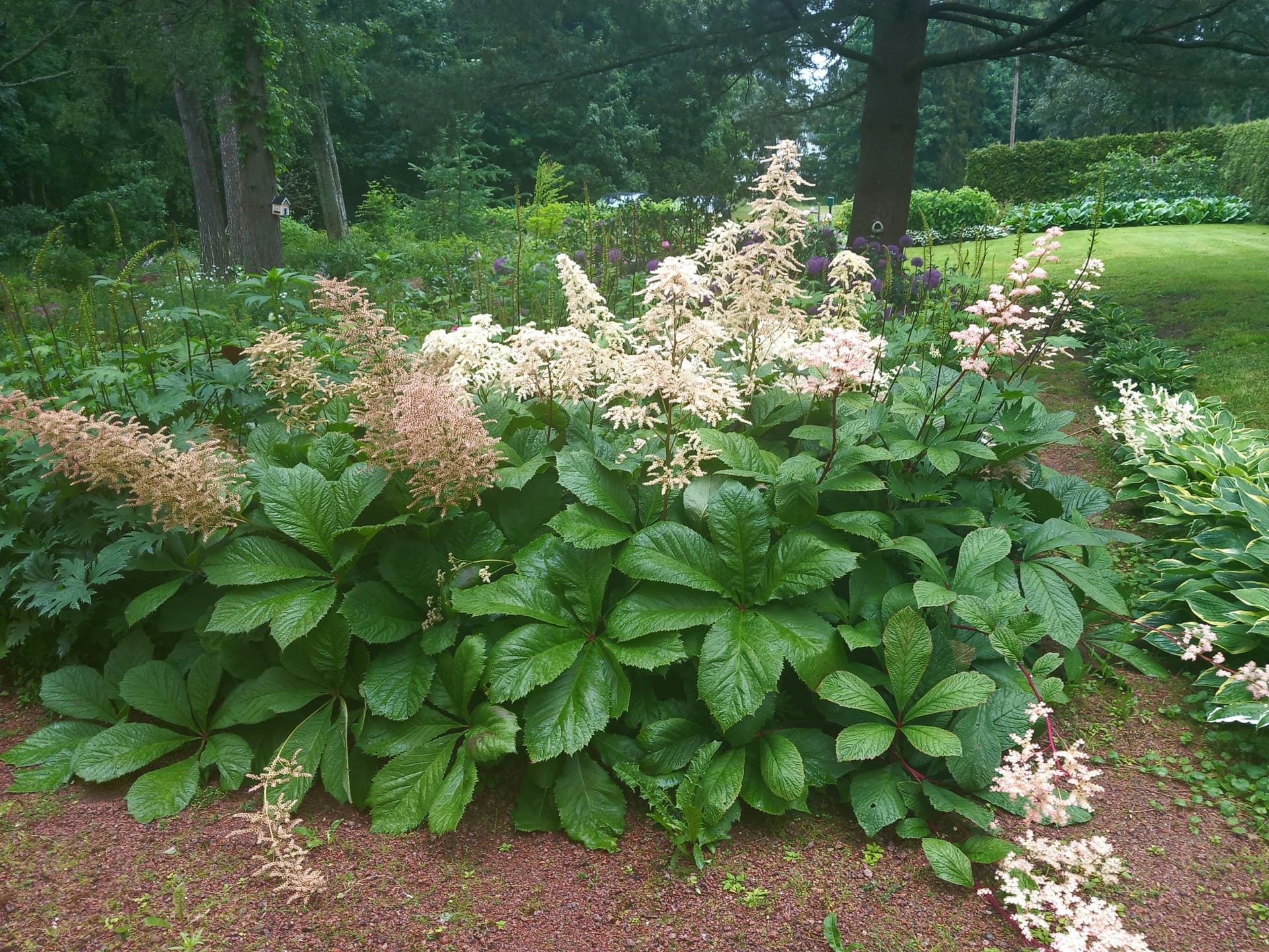 Taustalla Siperian kurjenniekat kukassa.Kääpiökurjenniekkojen kukinta ohi. Taustalla Isotöyhtöangervot aloittamassa kukintaa.