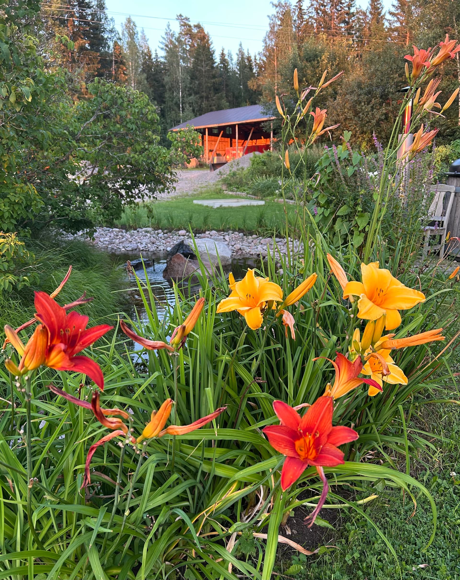 Lammen toisella reunalla kukoistavat erilaiset päivänliljat.
