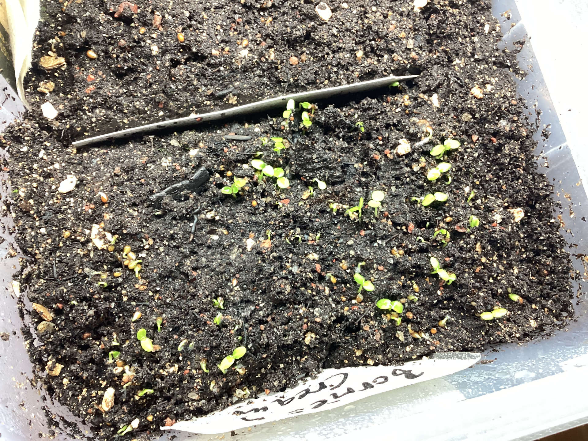 Kyllä näiden kanssa pärjäsi viime vuonnakin ihan hyvin ja silloin kylvin vielä aiemmin, marraskuun lopulla. Nämä on kylvetty selvästi joulukuun puolella, 1.12.2025. Jos orvokit venyy kevääseen mennessä, voi aina istuttaa syvempään.
