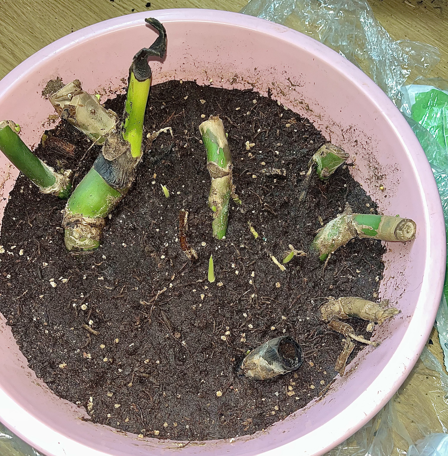 Rungot hajosi juuren luota, kun ovat rimpulaa, vedin ne myöhemmin pätkiksi ja pesuvatiin/multaa/vettä/ja kelmua päälle, alkuja näyttää lähteneen kasvamaan. Välillä muovikelmu pois, ettei home käy jylläämään.