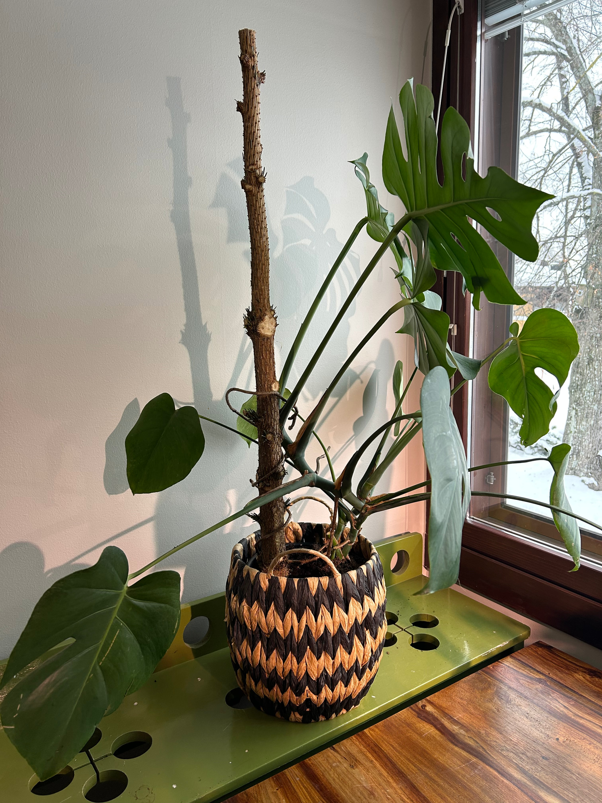 Oli aika siirtää peikonlehti isompaan ruukkuun ja tuunata sille joku tukikeppi. Katsoin, että puutarhaliikkeissä myydään sellaisia karvakeppejä, mutta enhän minä nyt nuukana ihmisenä sellaista osta! Pitää suosia kotimaista, joten joulukuusen latva saa kelvata. Noin!