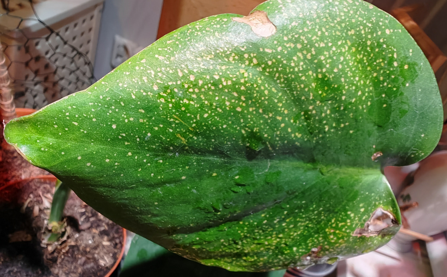 Tuo raato, syy miksi tuon otin, on se että vaikuttaa ns riisitautiselta Jättipeikonlehdeltä eikä Pikkupeikonlehdeltä, mitä kaupoissa pääosin myydään. Tuon lehdenjuuressa on tuo röpelömutka, jota pikkupeikolla ei ole ja tuossa lehdessä on 1 reikä, isomassa olisi enemmän… Kuvasta vasta huomasin, että Lohikäärme/Traakkipuulla näyttäisi olevan kukka tulossa,? Pitää kysyä mitä sille on käynyt, vai onko edes huomannut sitä ![]()