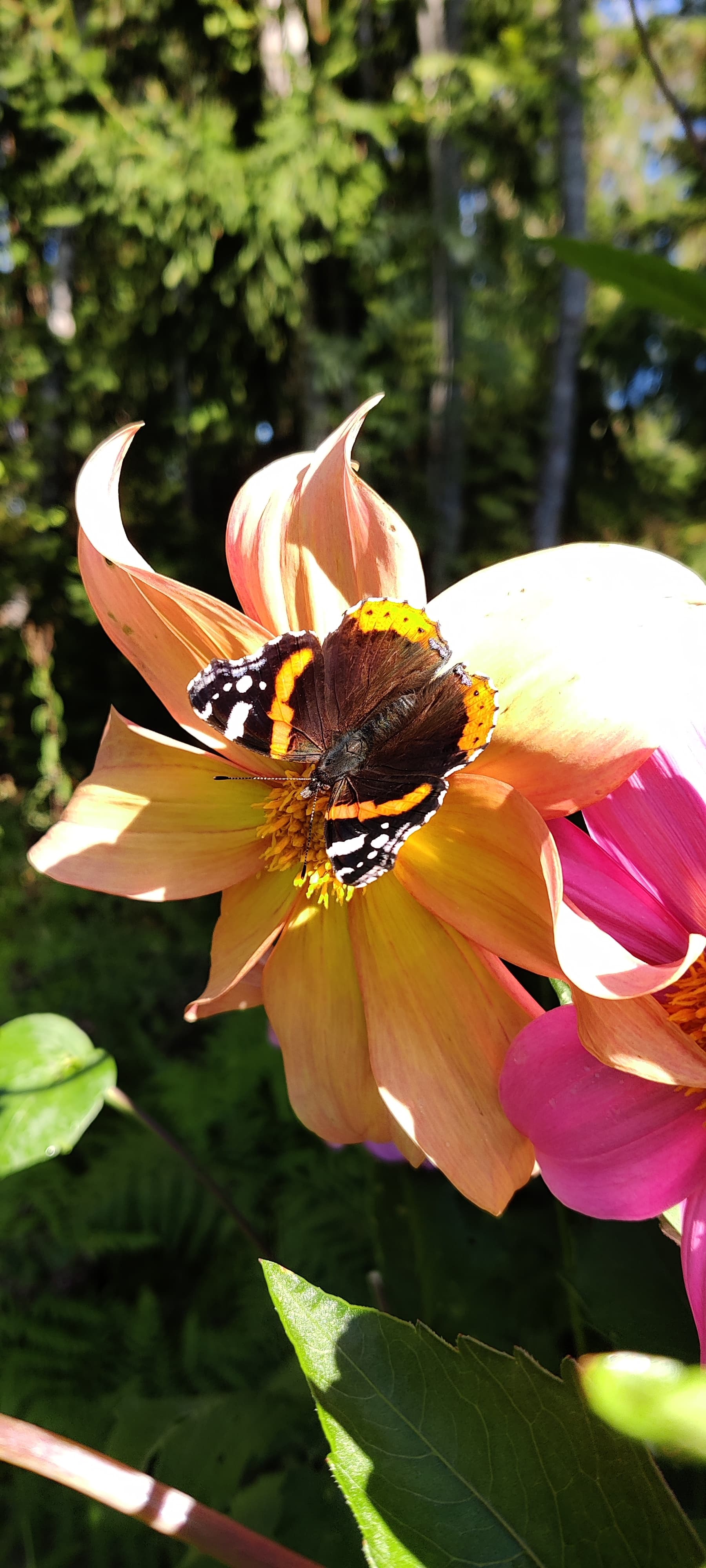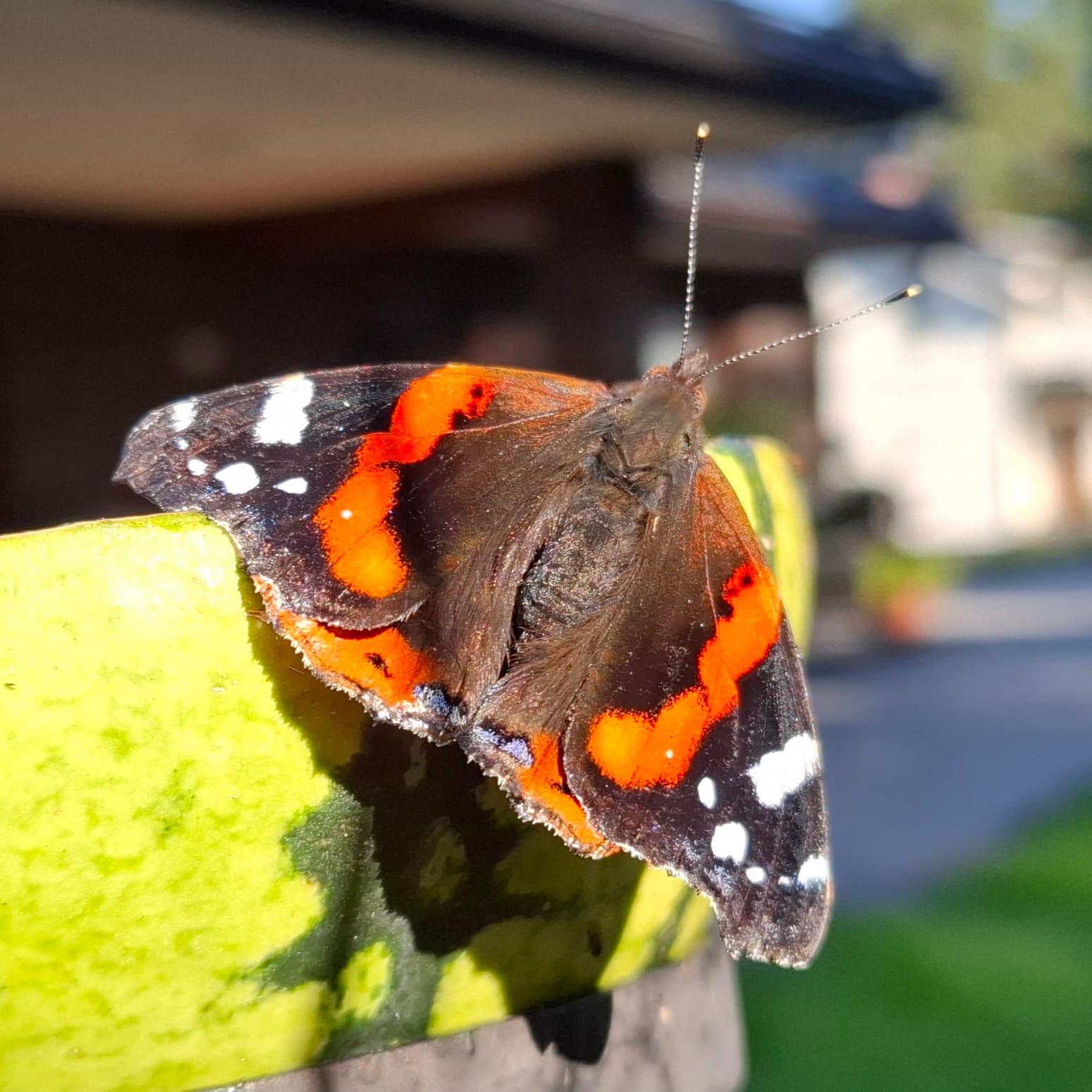 Erittäin iso valkoinen perhonen lentelee pihassa. Mikähän lienee, en ennen ole noin isoa nähnyt. Ei halunnut tulla kuvaan.