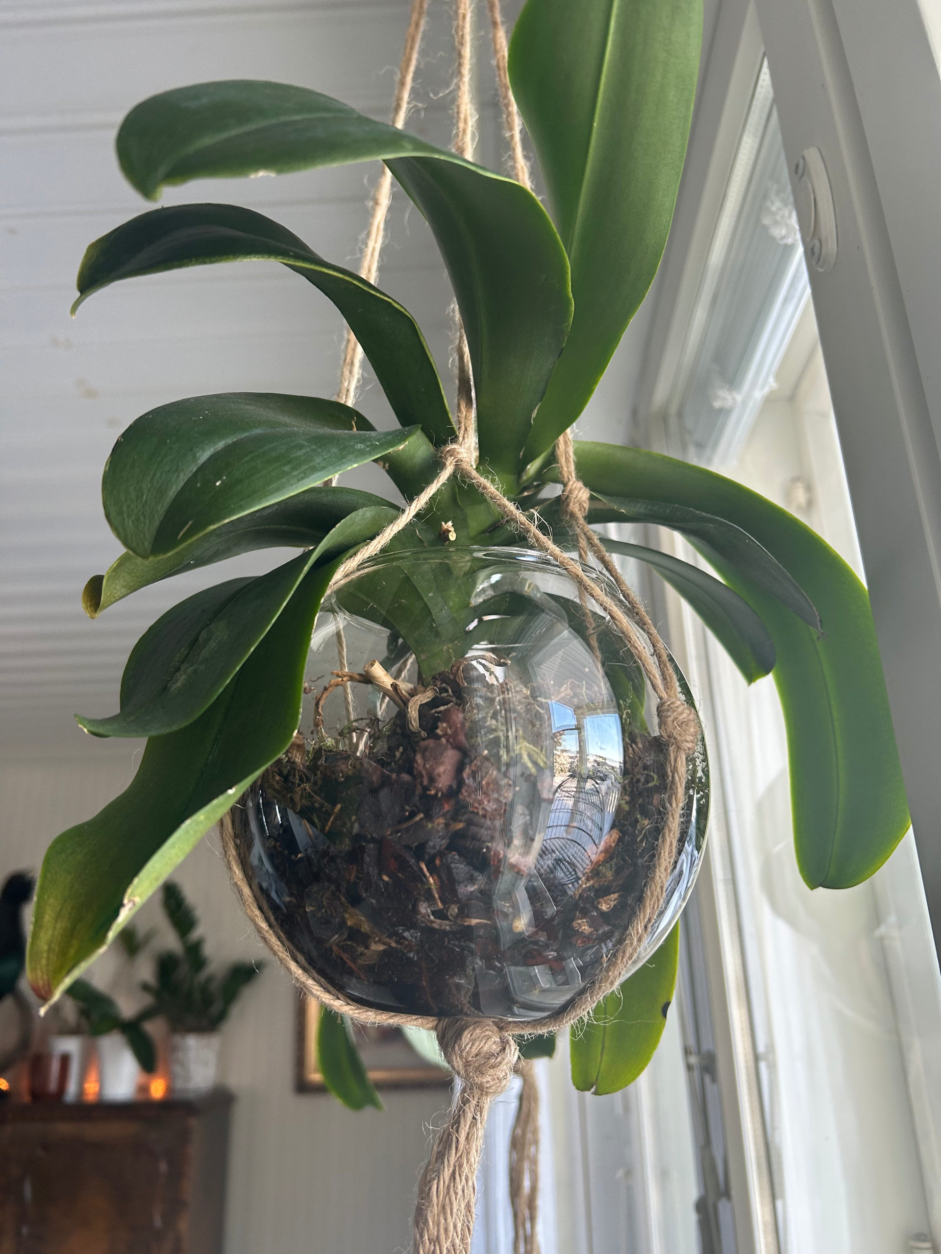 Kokeilen niille nyt tällaista amppelikasvatusta. Kasvualustana on hyvin väljästi kariketta ja sammalta.