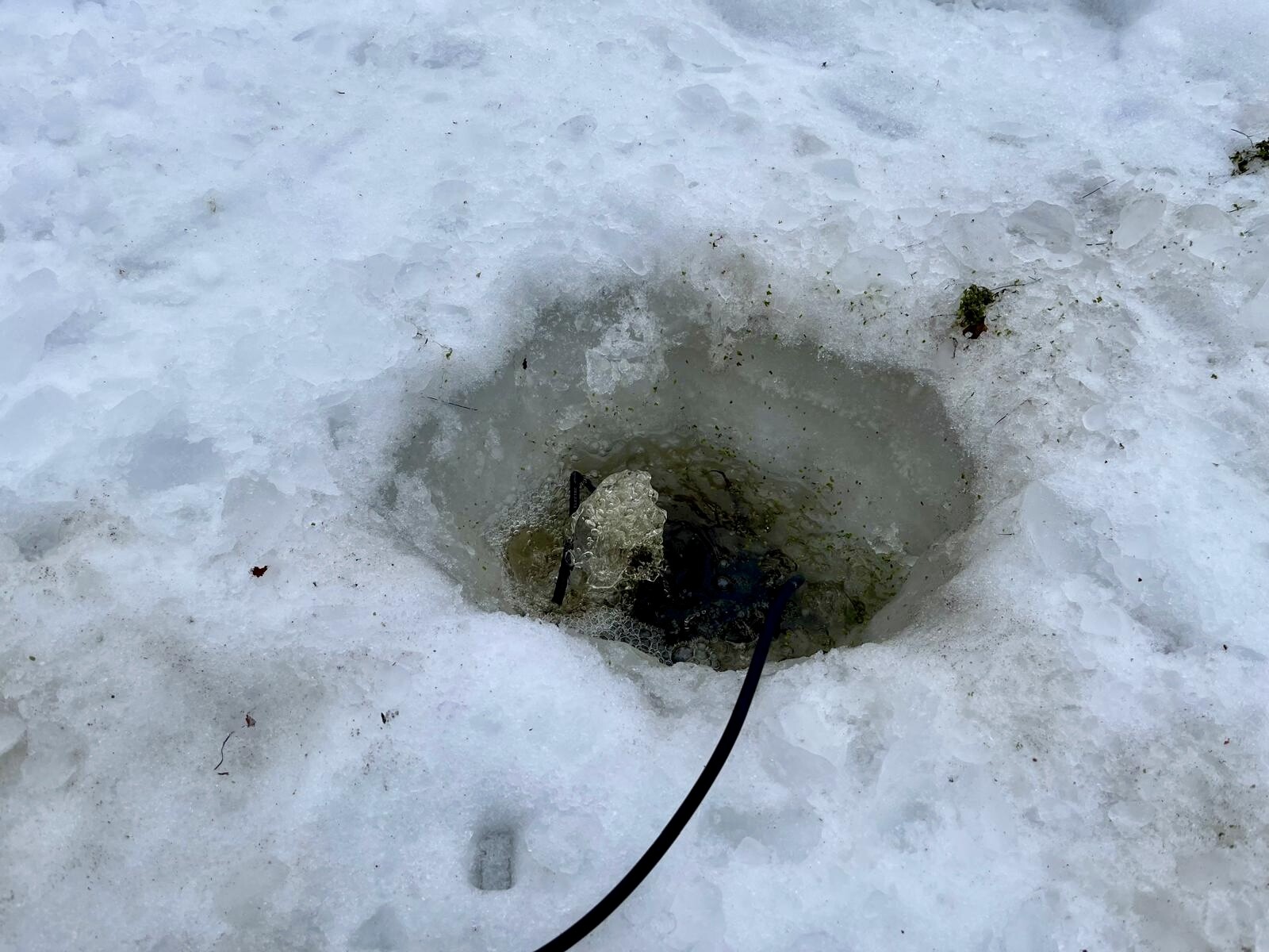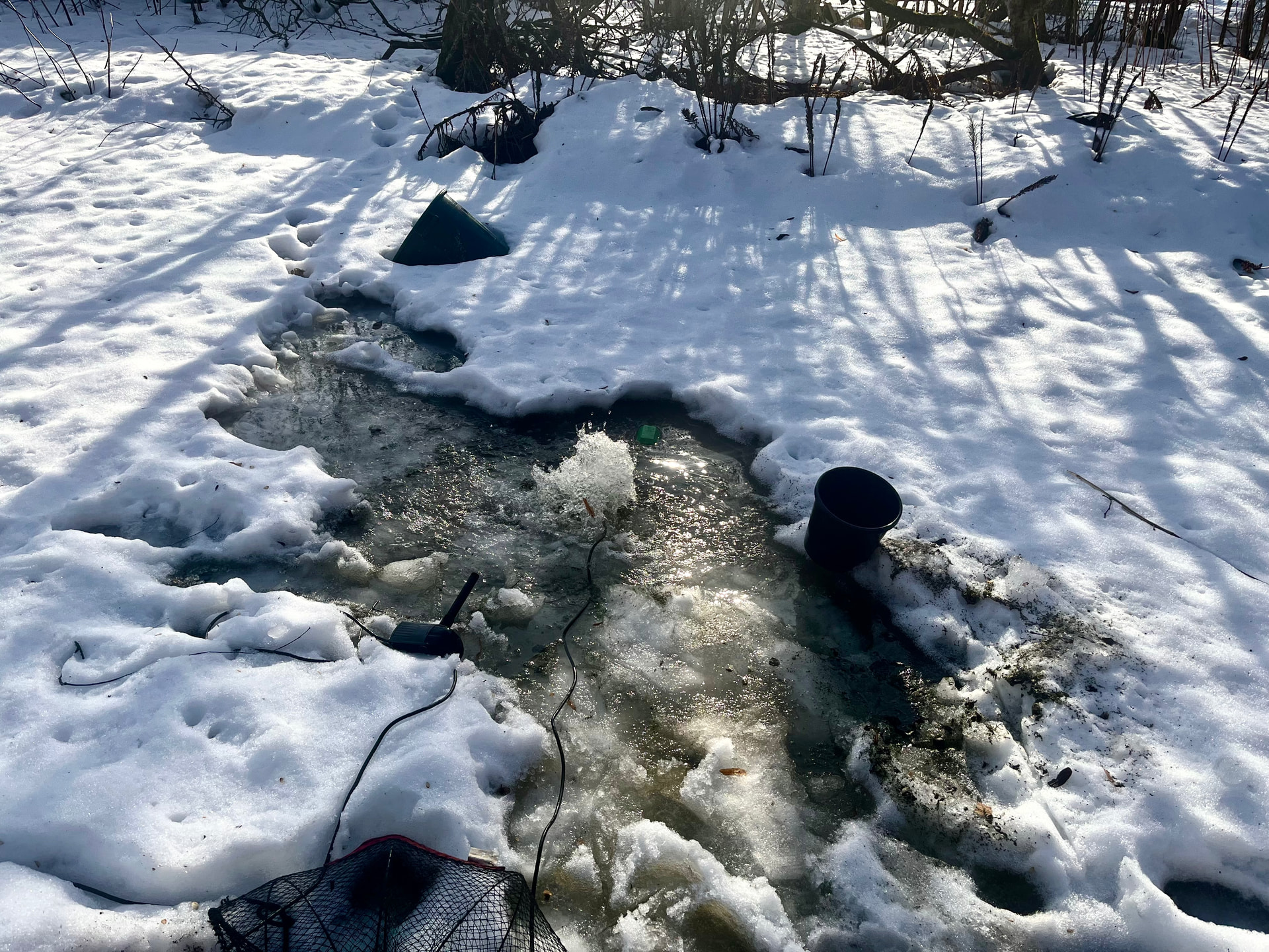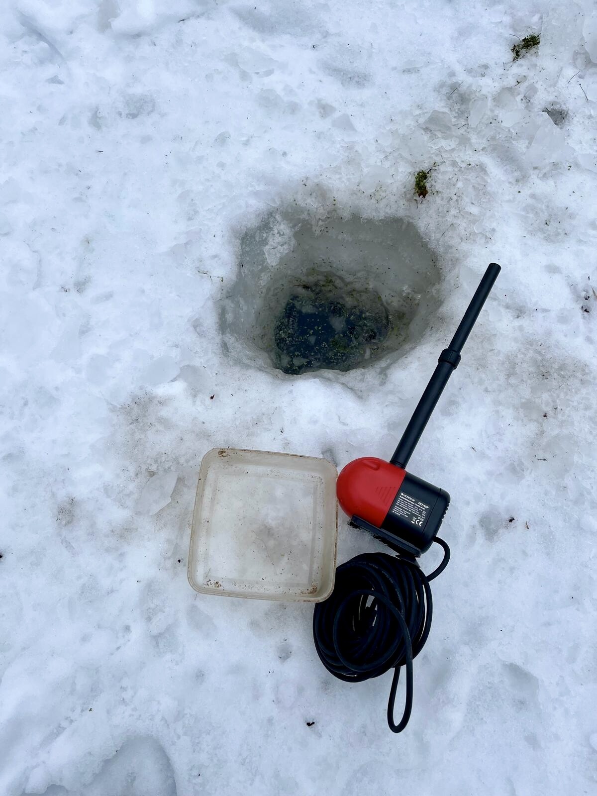 Alkuviikosta tein jäähän reiän, ei ollu paksua jäätä, suht helposti meni läpi. Eilen laitoin pumpun ämpärin sisään ja pulputtamaan