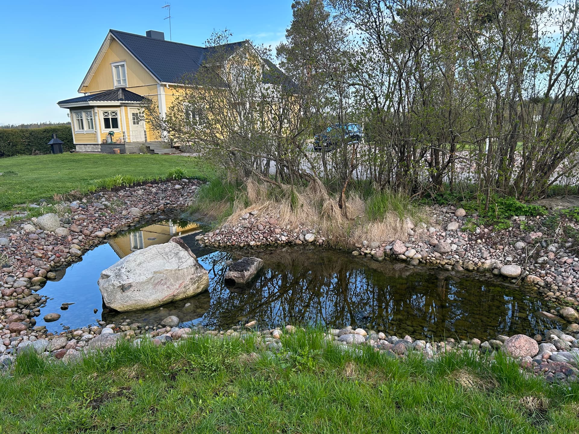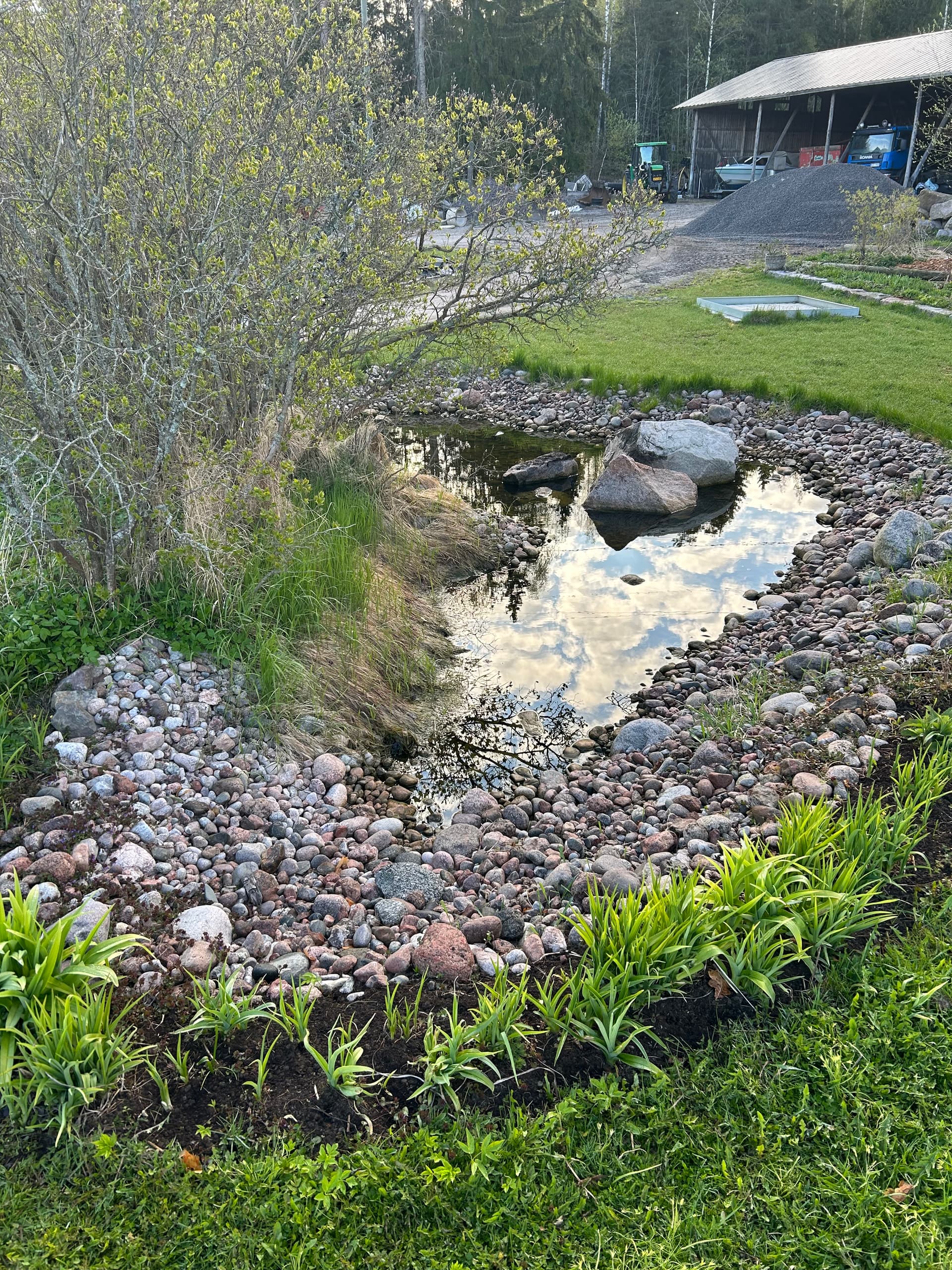 Tässä kuva tältä keväältä. Etualalla lammen reunassa kasvaa nyt erilaisia päivänliljoja. Takaosa lammen reunasta on tässä vielä työstämättä ja rikkaruohoontuu herkästi. Sen siistiminen oli tämän kesän projekti.