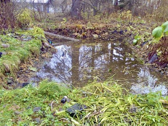 Mies pumppasi lammen tyhjäksi ja kaivoi kaivinkoneella lammen pohjan puhtaaksi. Samalla lampeen asennettiin salaojaputki, eli lampi ei kovallakaan sateella tulvi.