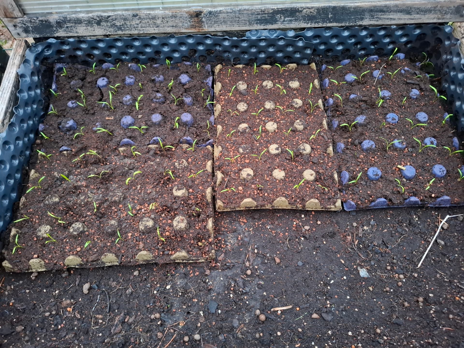 “Istutin” tänään munakennoporkkanat lavakaulukseen. Idätin siemenet märän talouspaperin päällä ja siirsin siitä kennoihin. Kennot oli muovilevyjen päällä kasvihuoneessa vajaa pari viikkoa ja nyt varovasti siirsin ne lavakaulukseen. Munakennojen pohjissa on ristiviillot, mutta luulen tuon kennon pehmenevän märässä mullassa niin että juuret kasvaisi siitä läpi ilman viiltojakin. Saas nähdä miten tämä kokeilu onnistuu.