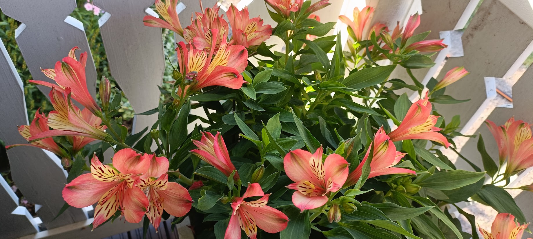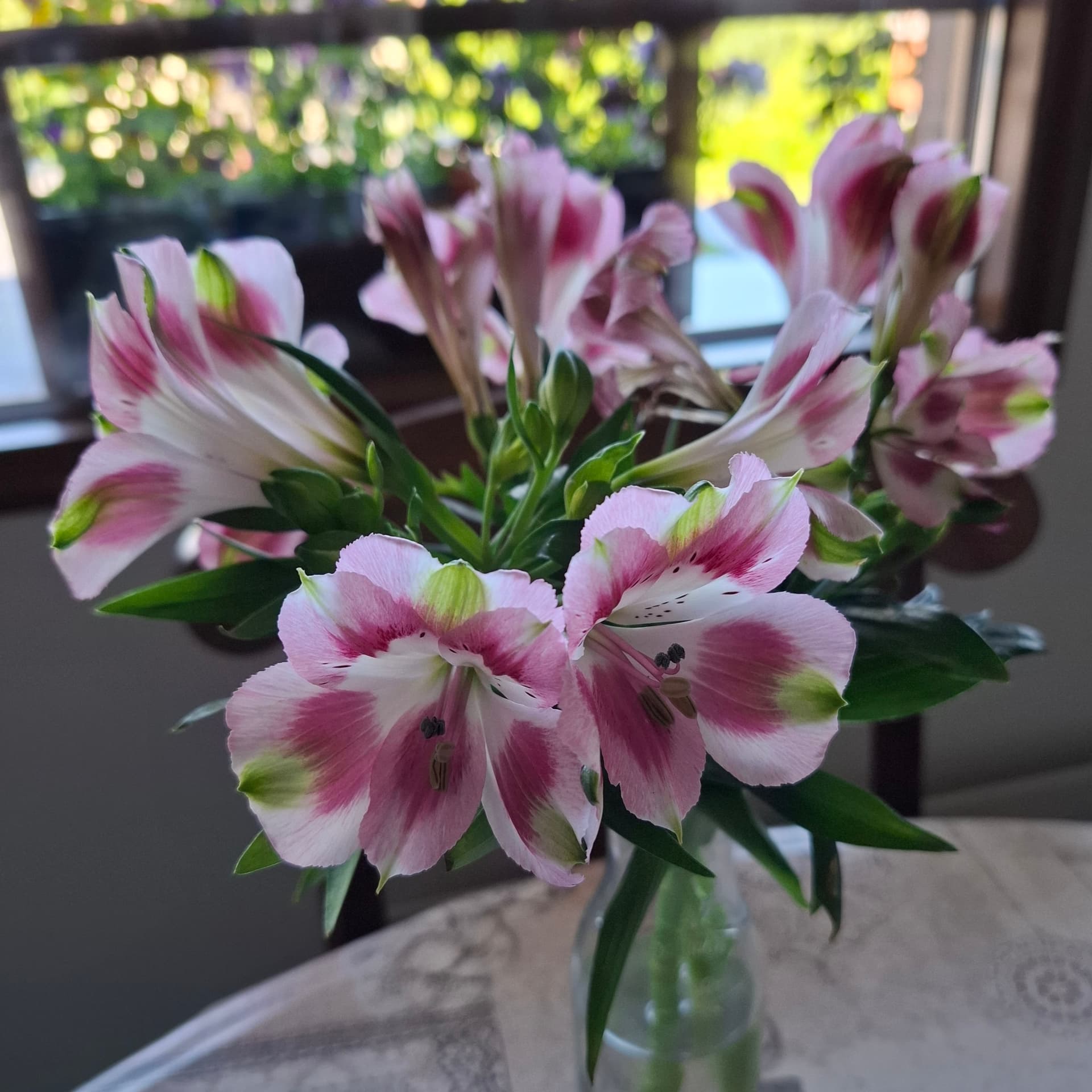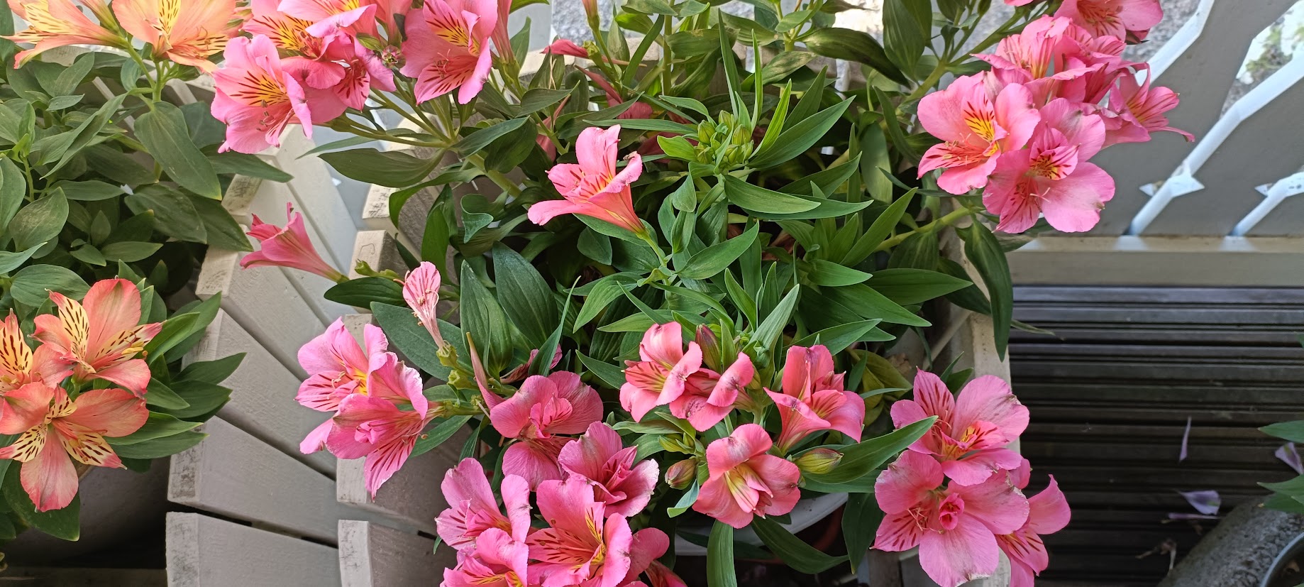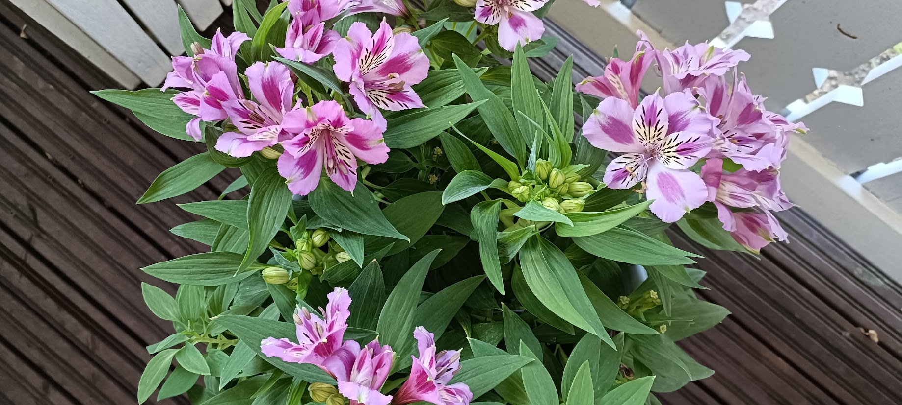 Tilasin Farmer Gracyltä prinsessaliljan juurakoita ja niissä on vasta nupun alkuja. Viimeviikolla löysin marketin puutarhaosastolta poistomyynnistä kukkivan ison inkaliljan 5 eurolla. Osa kukkivista varsista oli melkein poikki, joten kotiin päästyä irrotin ne kukkavarret ja toin sisälle maljakkoon. Mun mielestä oli aika hyvä diili kun vitosella sain ruukku- ja leikkokukat.