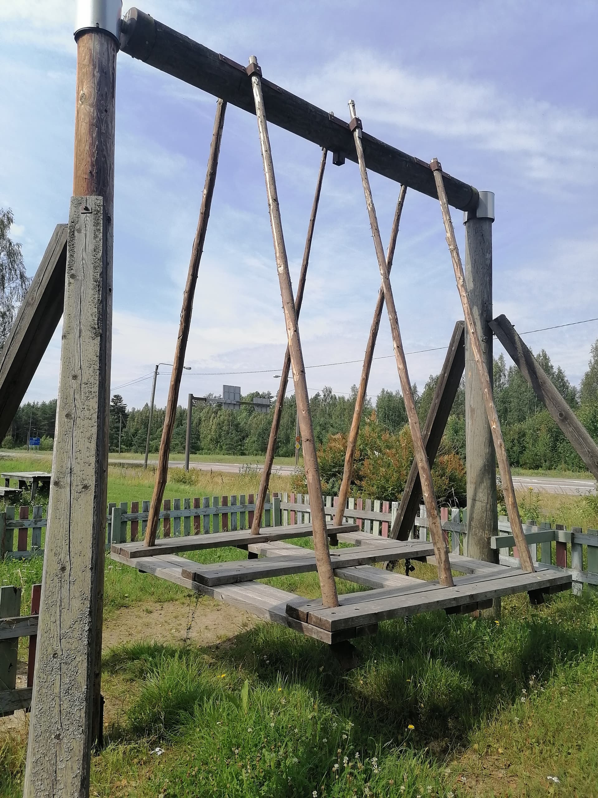 Puutyö tääkin. Tesjoella Loviisassa oli tällainen keinu, en oo koskaan ennen nähnyt moista. Niitä vastakkain istuttavia keinuja, niitä joille annettiin vauhtia työntämällä jaloilla sitä penkkien välistä lattiaa, oon nähnyt paljon mut tällainen seisten keinuttava useemman hengen keinu oli ihan uusi tuttavuus.