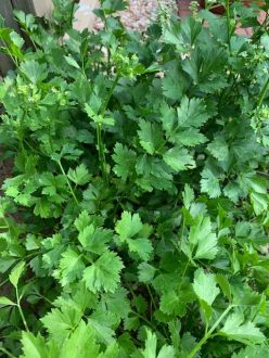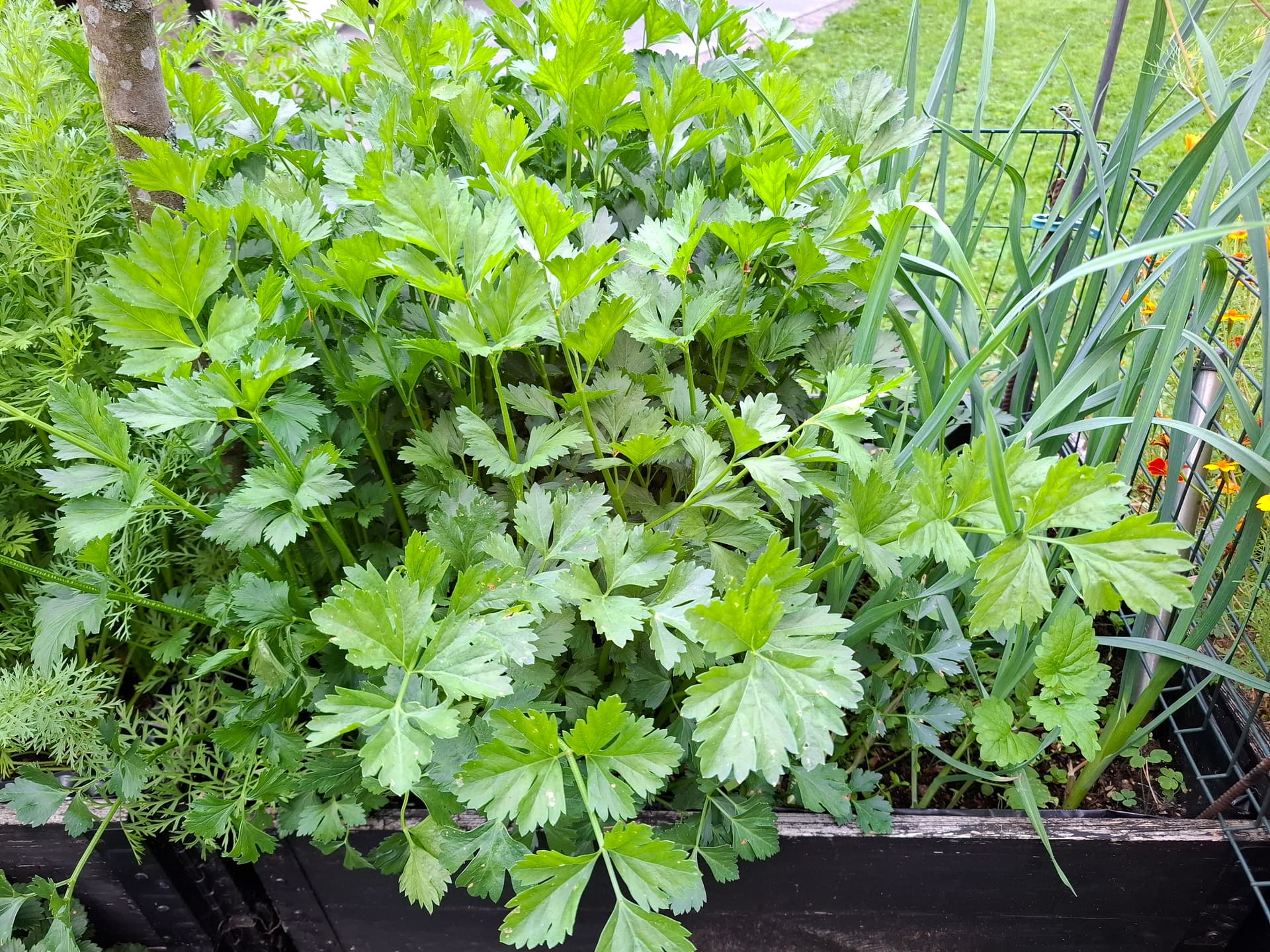 Minä ostin juhannuksen aikoihin poistomyynnistä pari taimipurkkia, mitkä oli kylvetty täyteen lehtiselleriä. Erottelin taimia ja istutin niitä tyhjään pieneen lavaan samalla ostettujen purjon taimien kanssa. Nyt minulla kasvaa tiheä pöheikkö selleriä. Ne ei ole noin komeita kuin Karvarilla, mutta olen sieltä jo varsia käyttänyt ruuan maustamiseen.