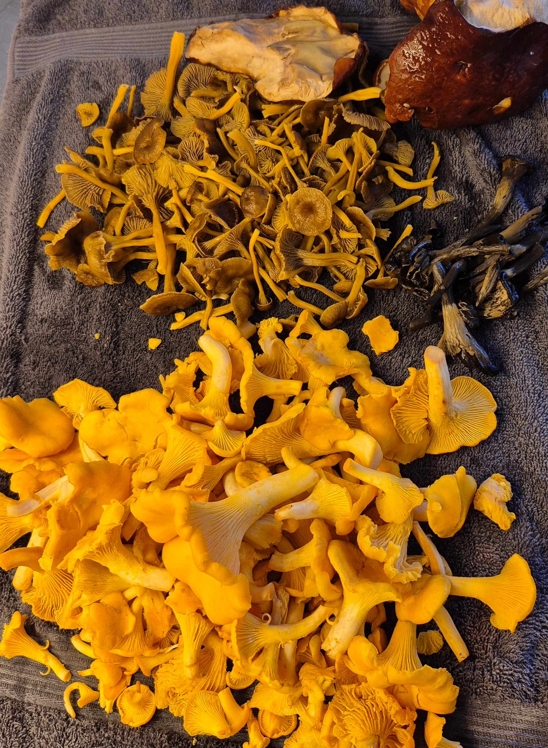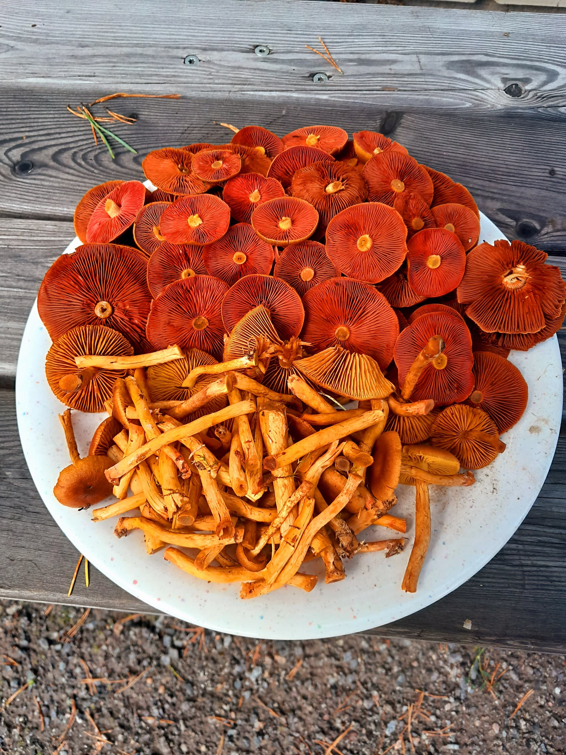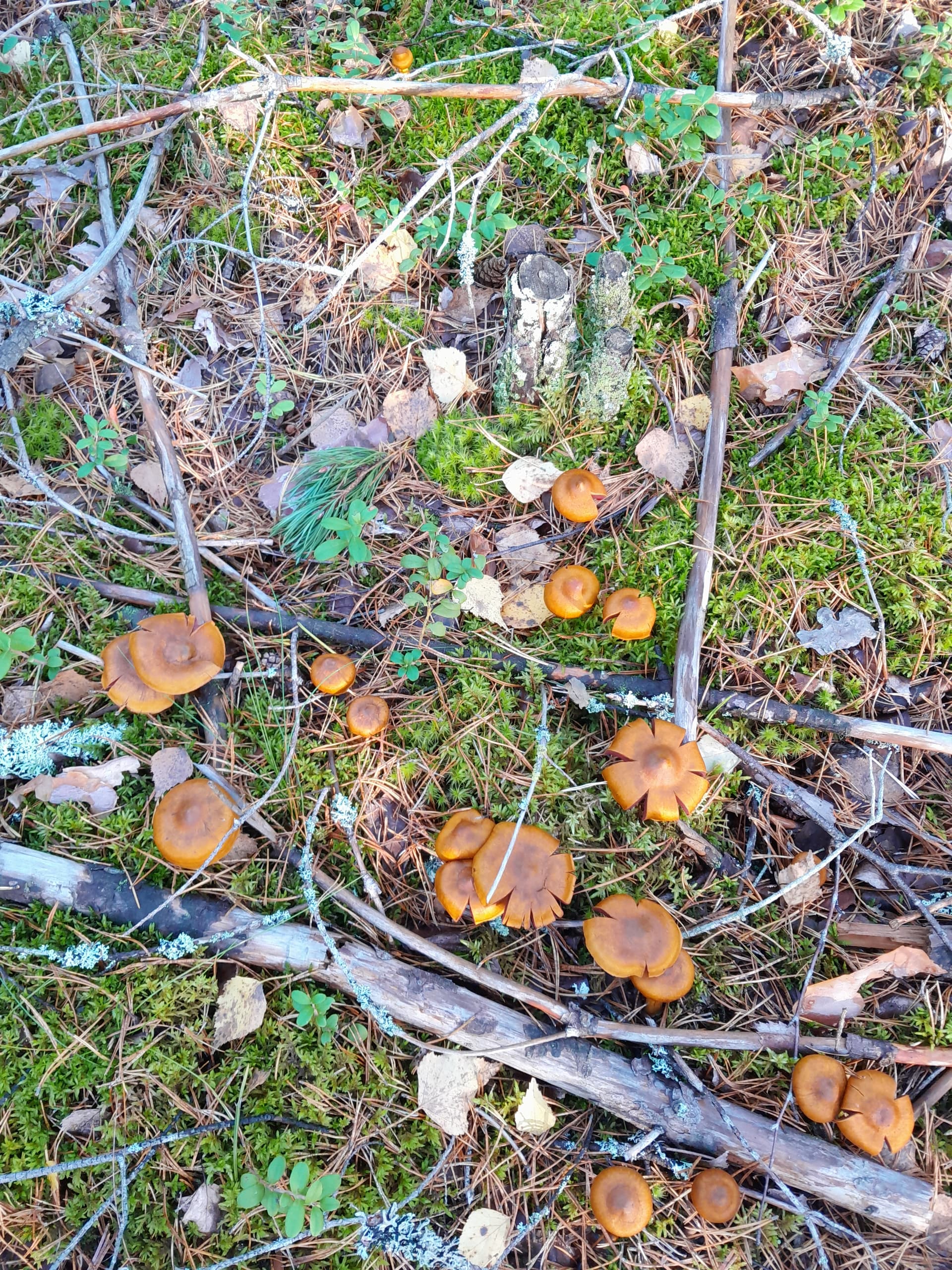 Kantarellejä ja suppilovahveoita näkyy paljon, ja jotain vaaleamman punertavia ja viinipunaisia haperoita on myös paljon.