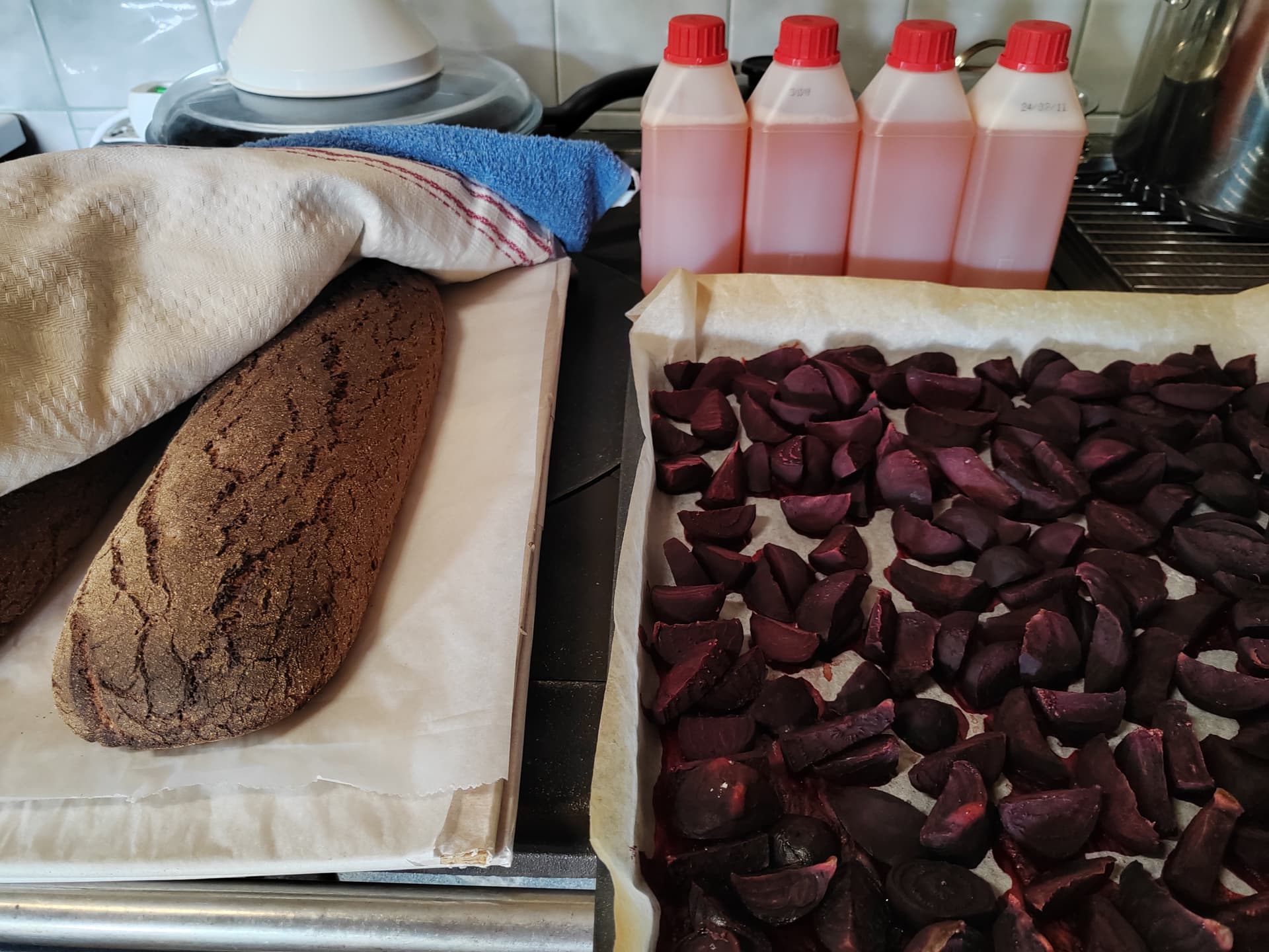 Tänään ruisleiväntekopäivä, punajuuria paahdoin uunijuureksia varten ja omenien mehustus jatkuu grillimökissä joten välillä pyörähdän sielläkin.