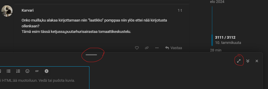 Jos kirjoitata tietokoneella, niin oletko muuttanut vastausikkunan kokoa siirtämälä hiirellä tuosta viivan kohdalta? Se koko näyttää menevän muistiin.