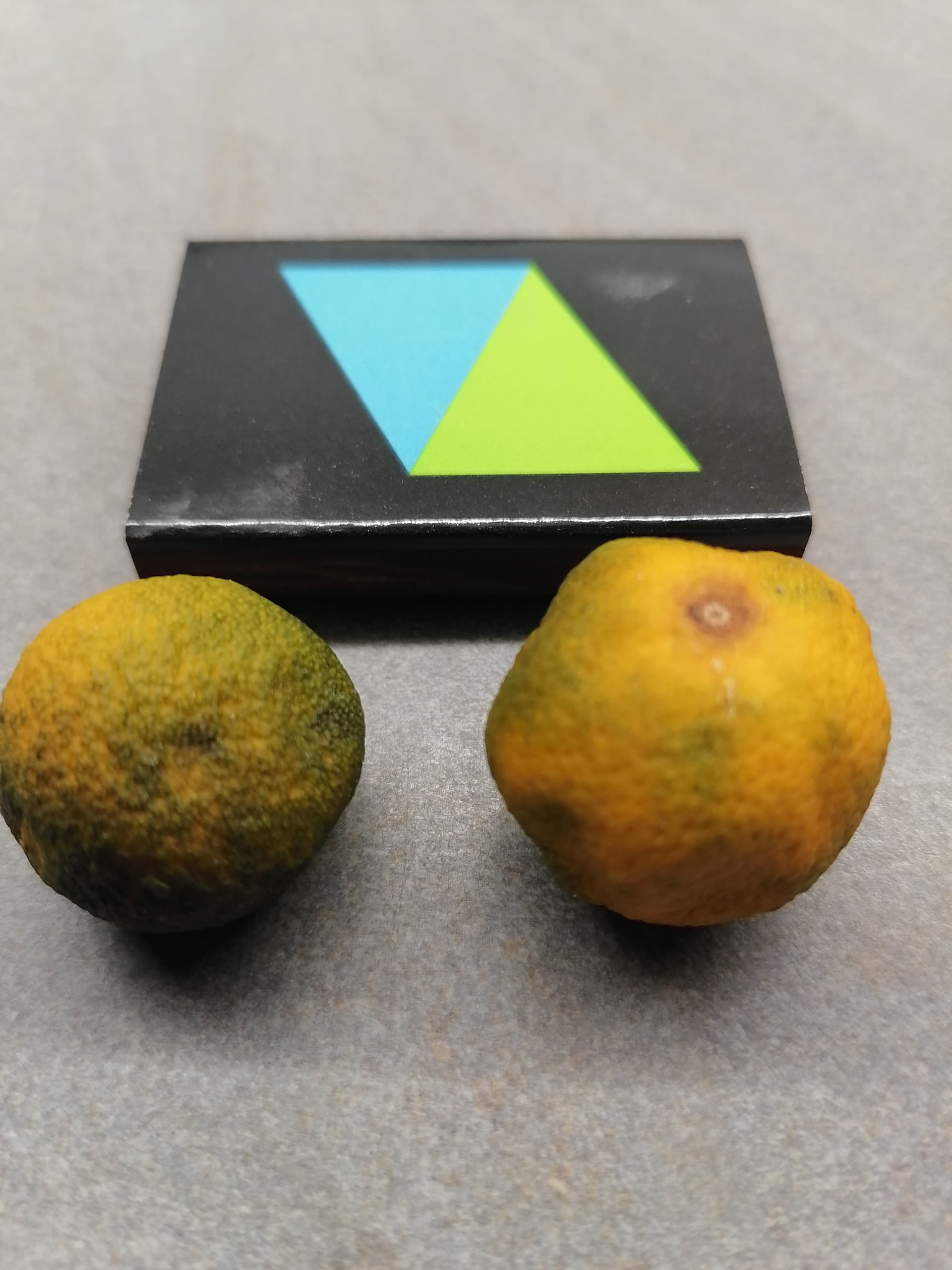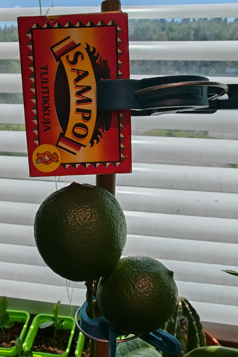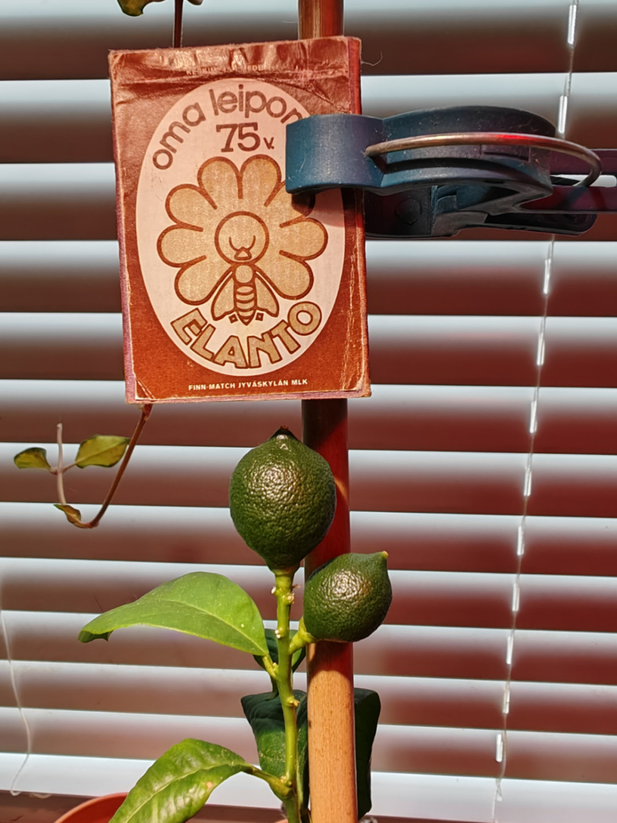 Sain ystävältä kaksi Calamansia. Hänen miniänsä on filippiiniläinen ja siellä se on keittiössä vakiotuote. Nämä hedelmät oli vielä vihertävät joten en oo varma itävätkö siemenet. Oon nyt pitänyt niitä viikon verran pöydällä ja väri on tullut keltaisemmaksi. Kypsänä kuori on kelta-oranssi nähtävästi.