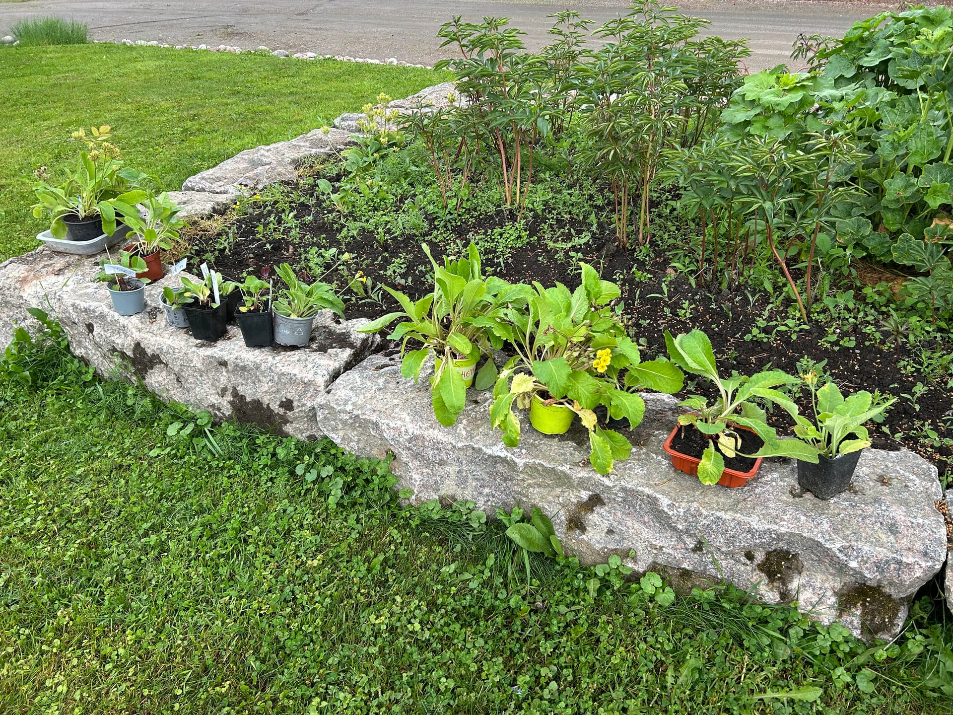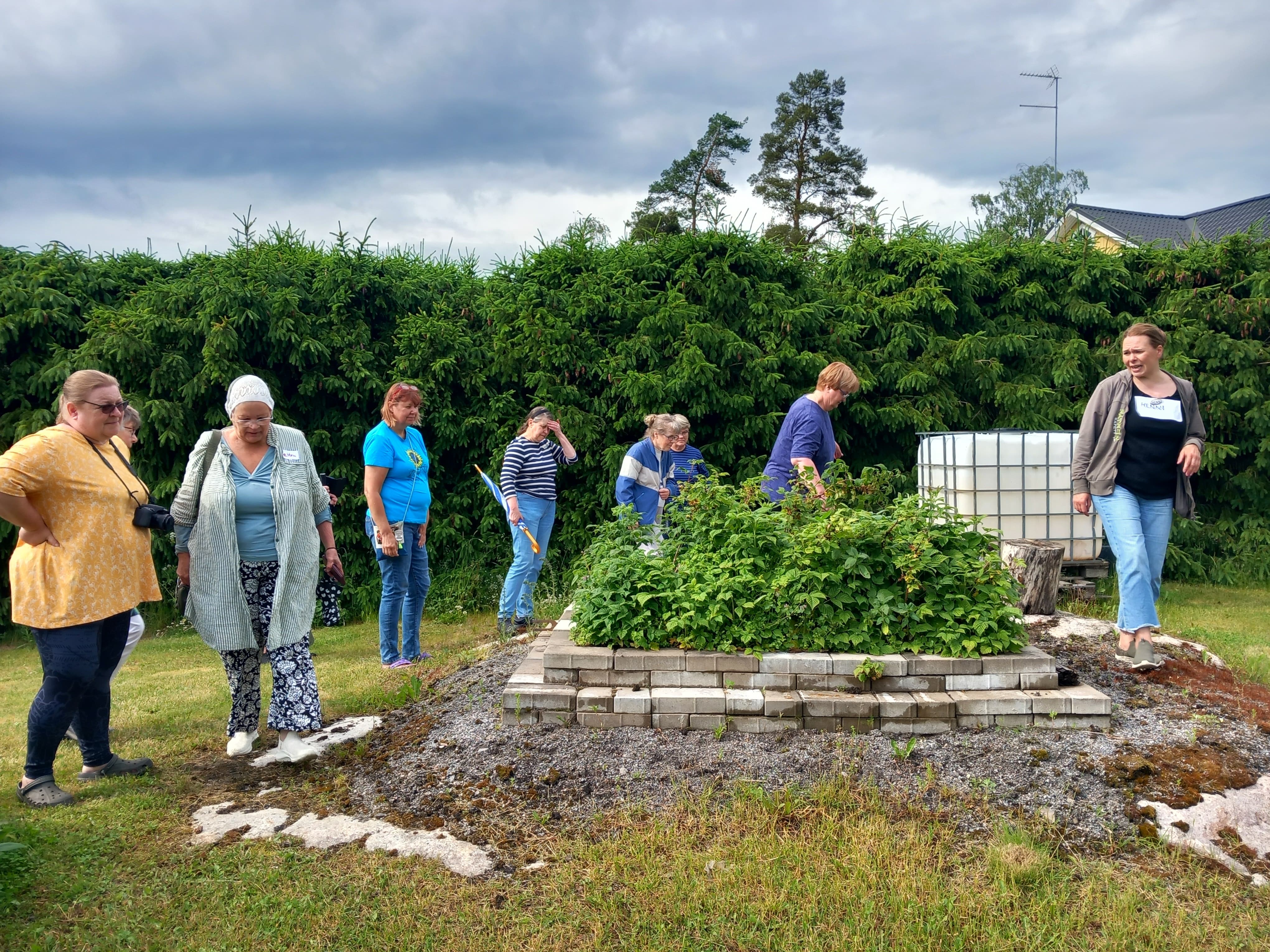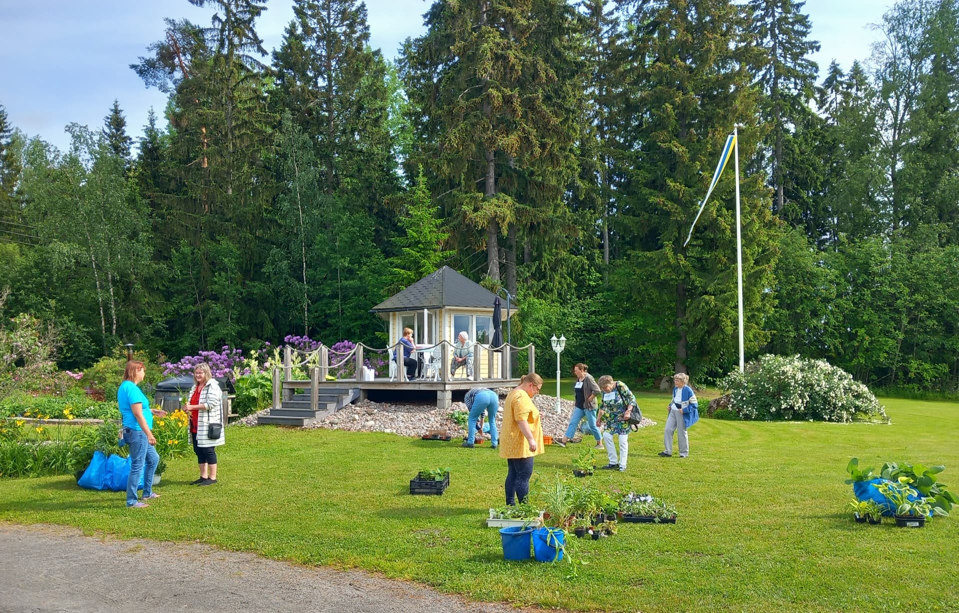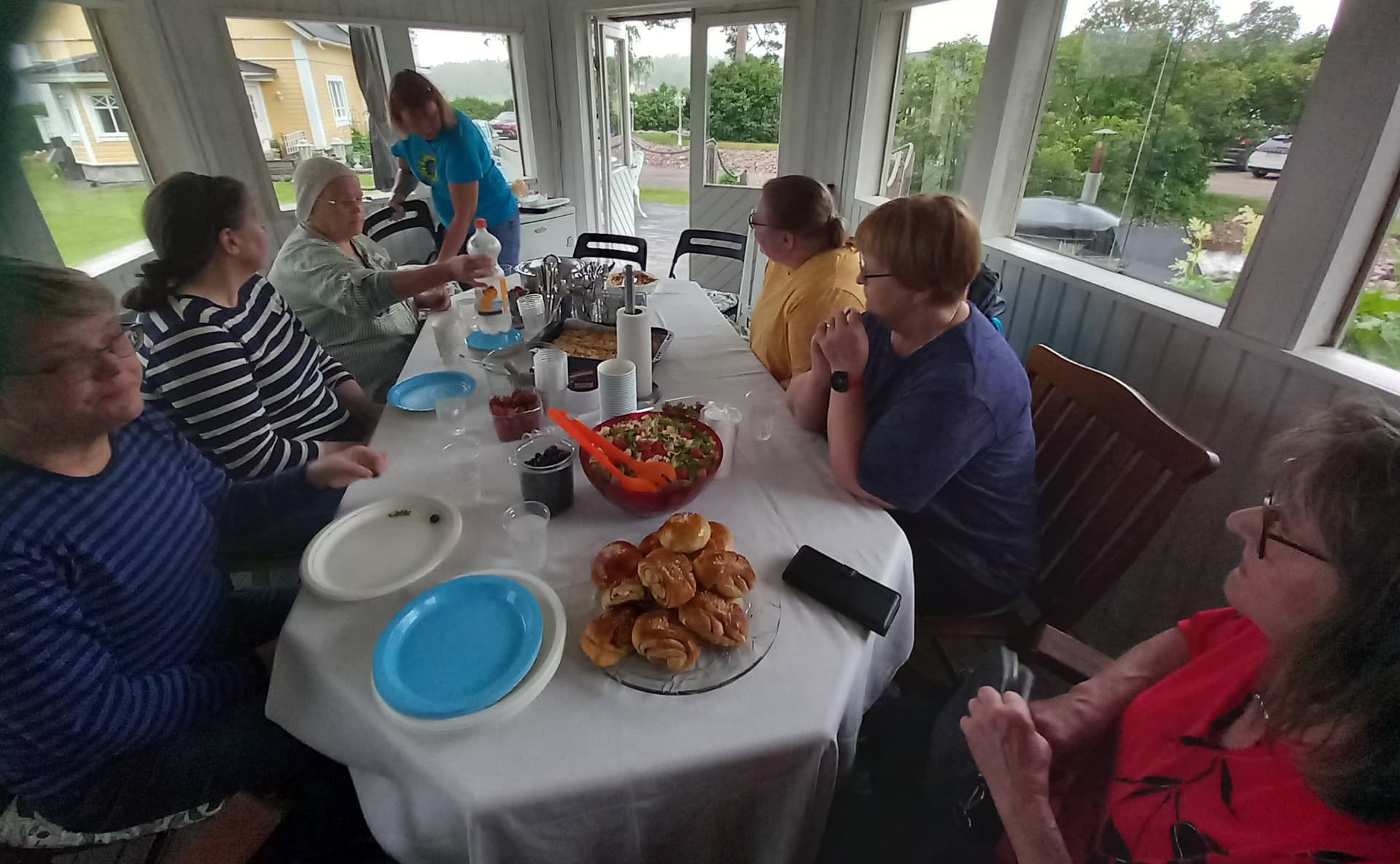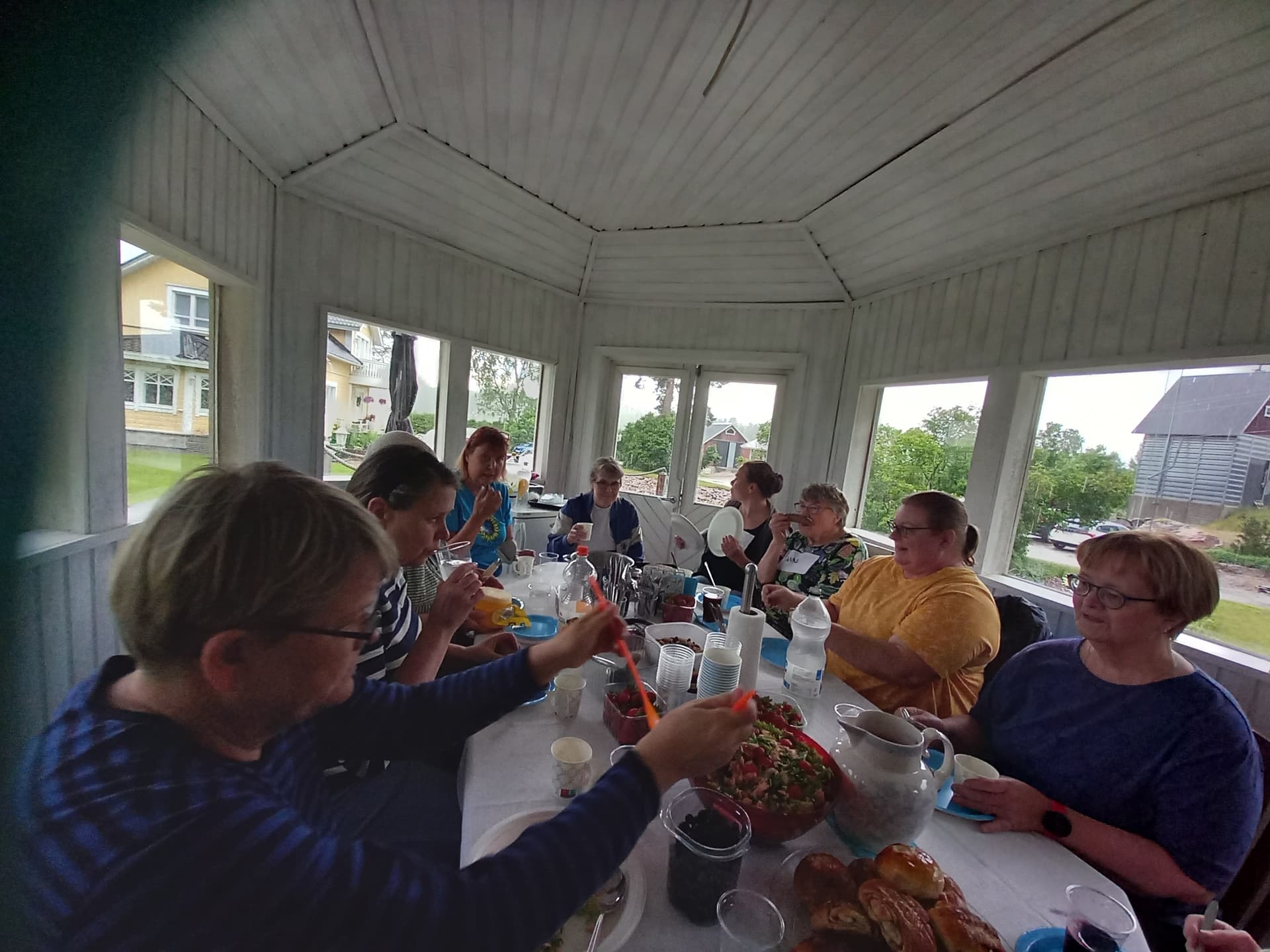 Kun taimet oli vaihtaneet omistajaa ja pihakierros tehty alkoi pisaroimaan. Kerkisimme hyvin siirtyä pihamajaan pöydän ääreen ennenkuin sade taas alkoi. Tais olla emäntä ainut joka kastui kun joutui pariin kertaan kipittämään talon ja pihamajan väliä.
