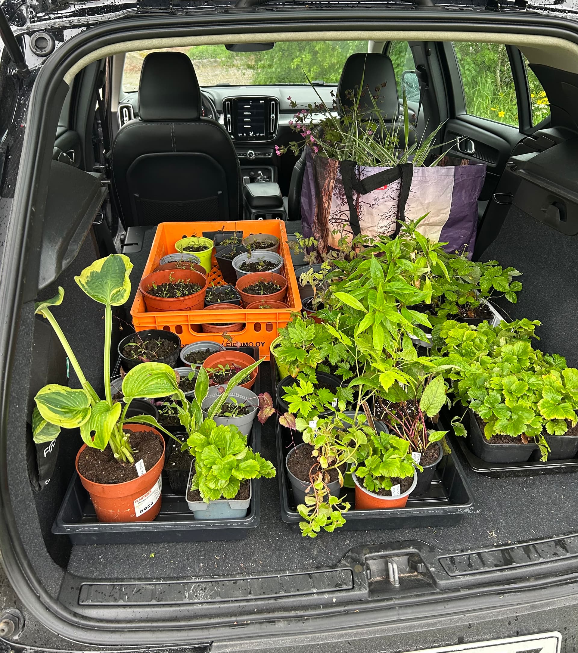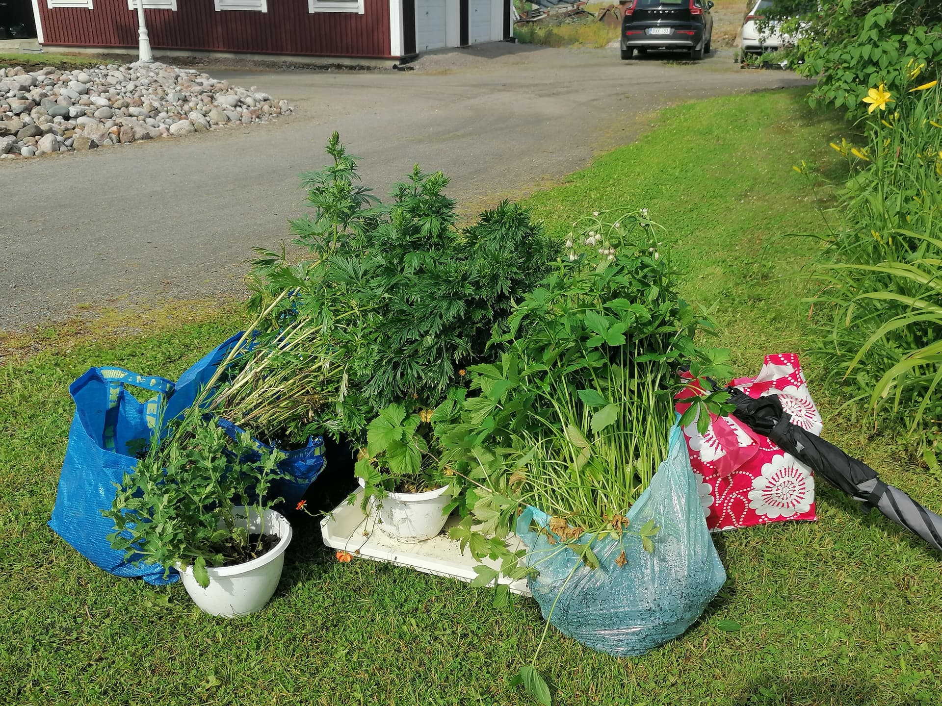 Tässä taimilasti ylijääneitä matkalla Helsinkiin, saavat paikan kahden eri ystäväni pihoilta. Kiitos heidän puolestaan!