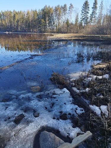 Ei ole kukkia eikä vihreää esiteltävissä. Jääputous ja jäätä löytyi lahden pohjasta. Koivun siitepölyä on ennätysmäärä, olen allergian takia ihan voimaton. Silmät ja nenä vuotaa, naamaa kirvelee ja polttaa kuin olisi palanut. Mökillä ollaan tytön kanssa, rantalomalla.