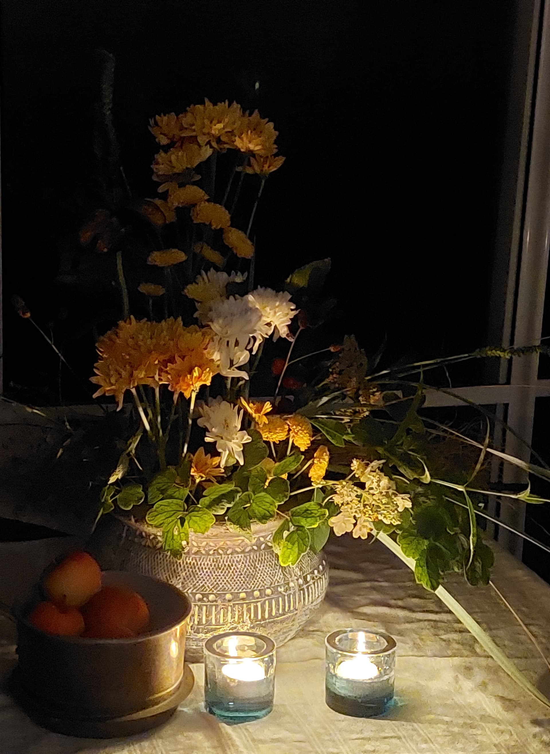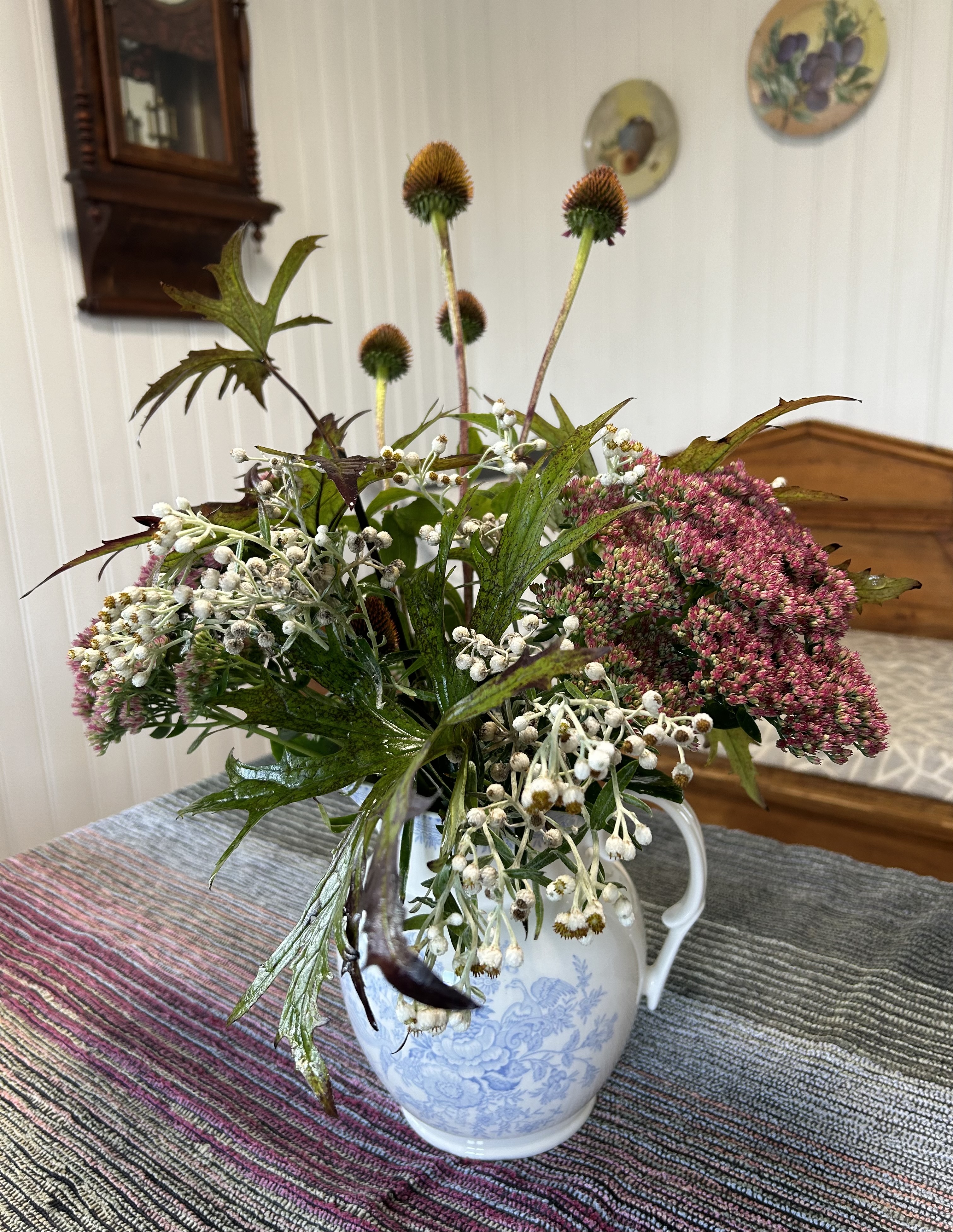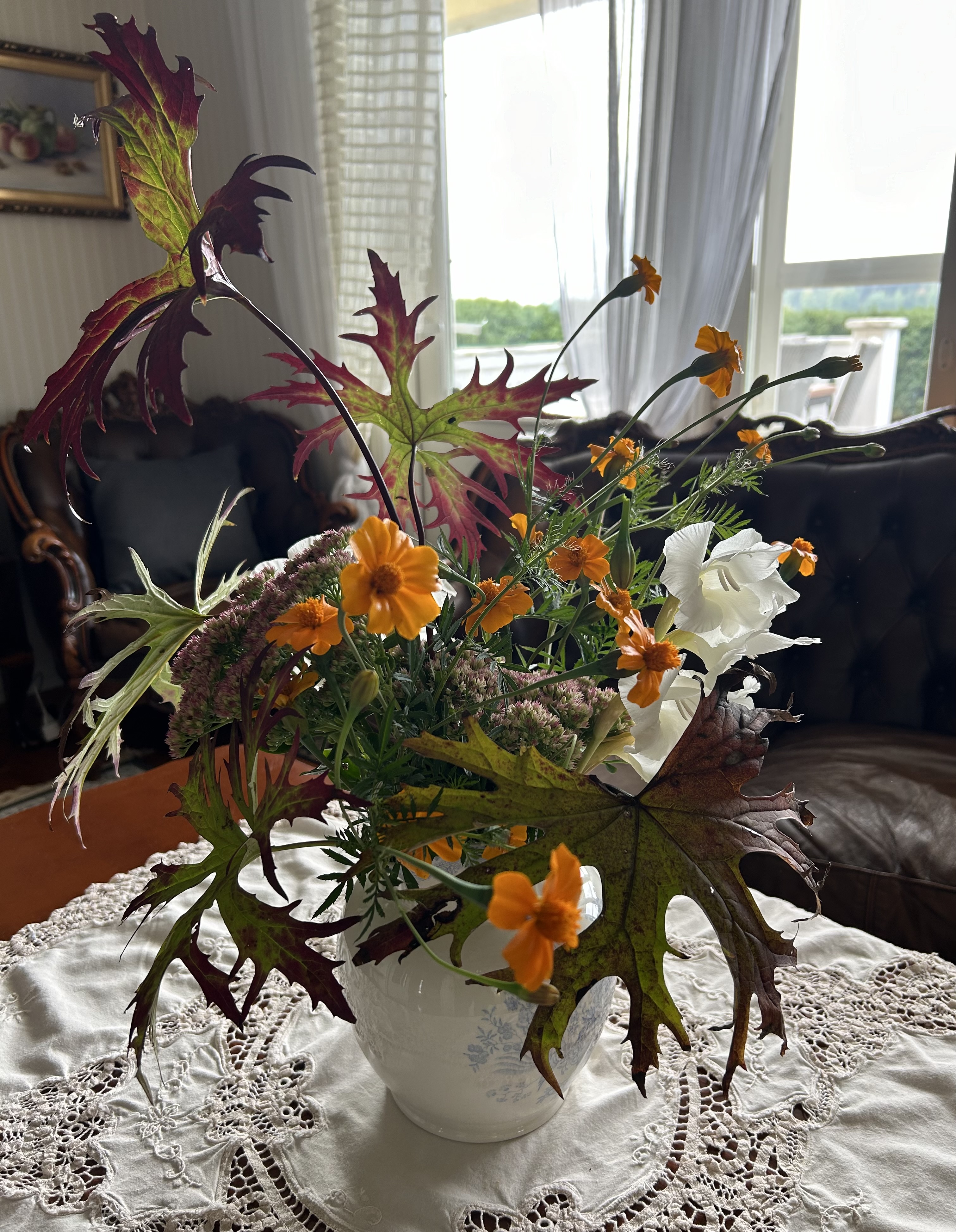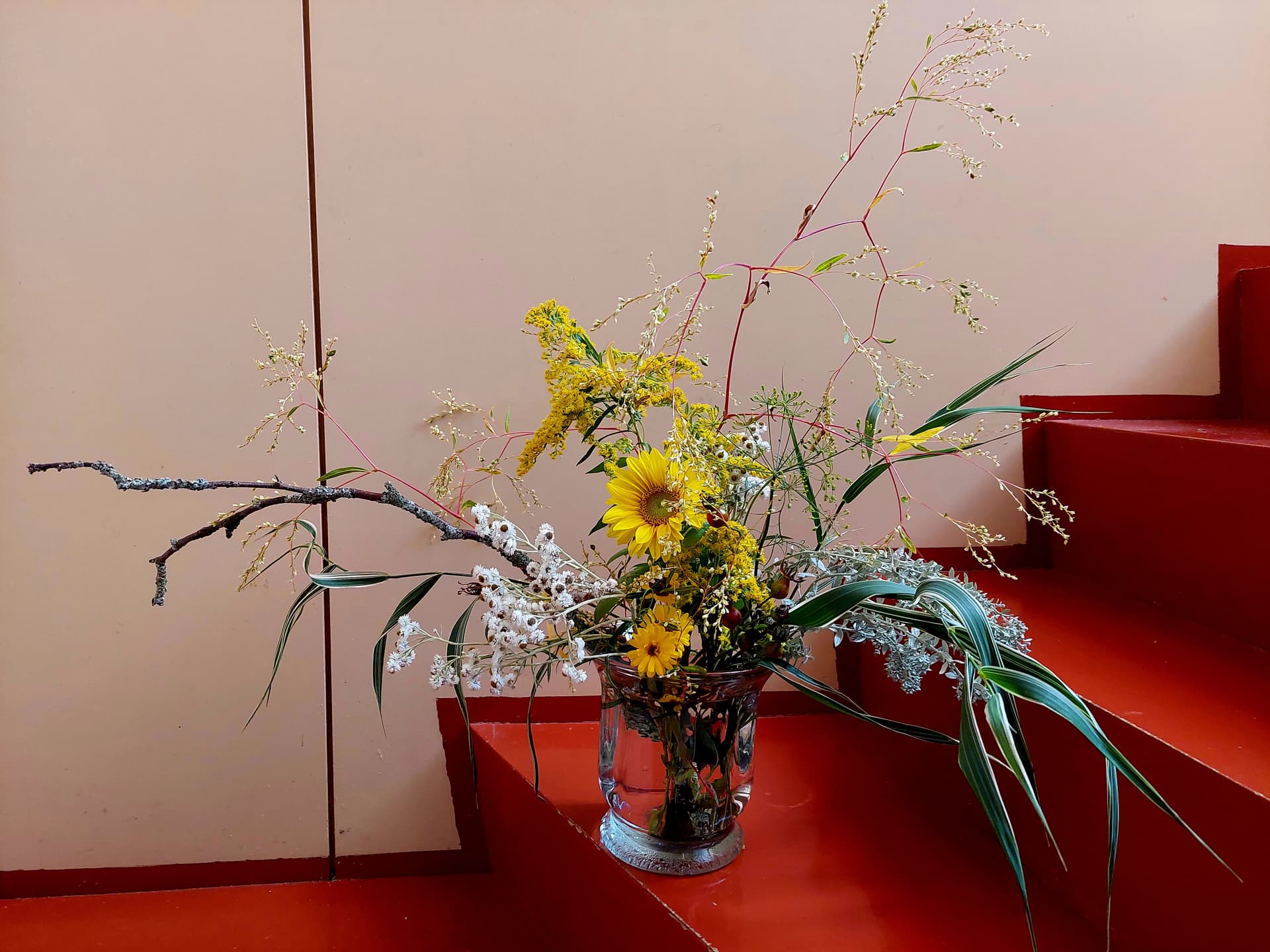 Nyt olin tosi taiteellinen. Tässä on maksaruohoa, viimeiset gladiolukset, sammareita ja valtikkanauhuksen lehtiä.