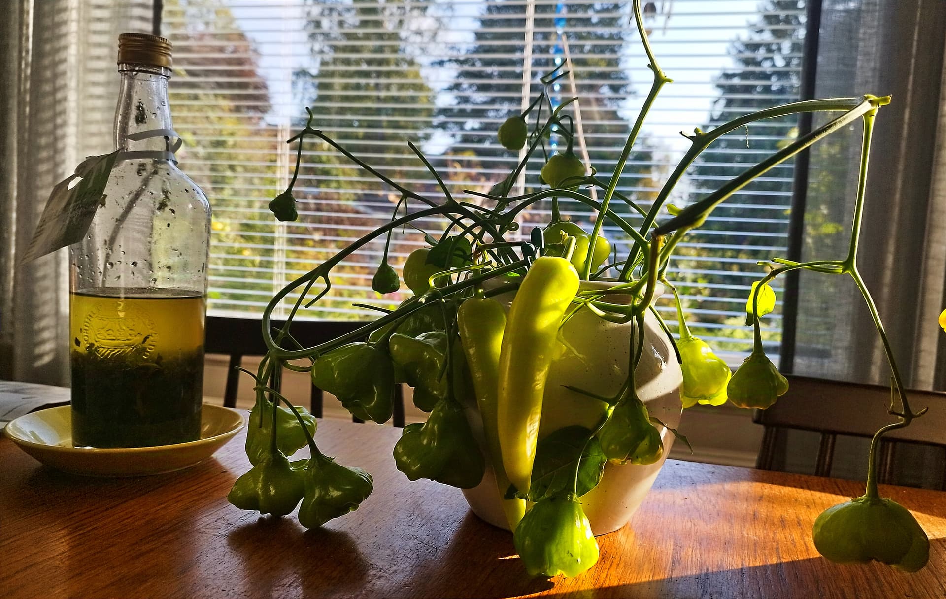 Maljakossa kypsymässä chili Jamaican Bell ja viimeiset suippopaprikat.