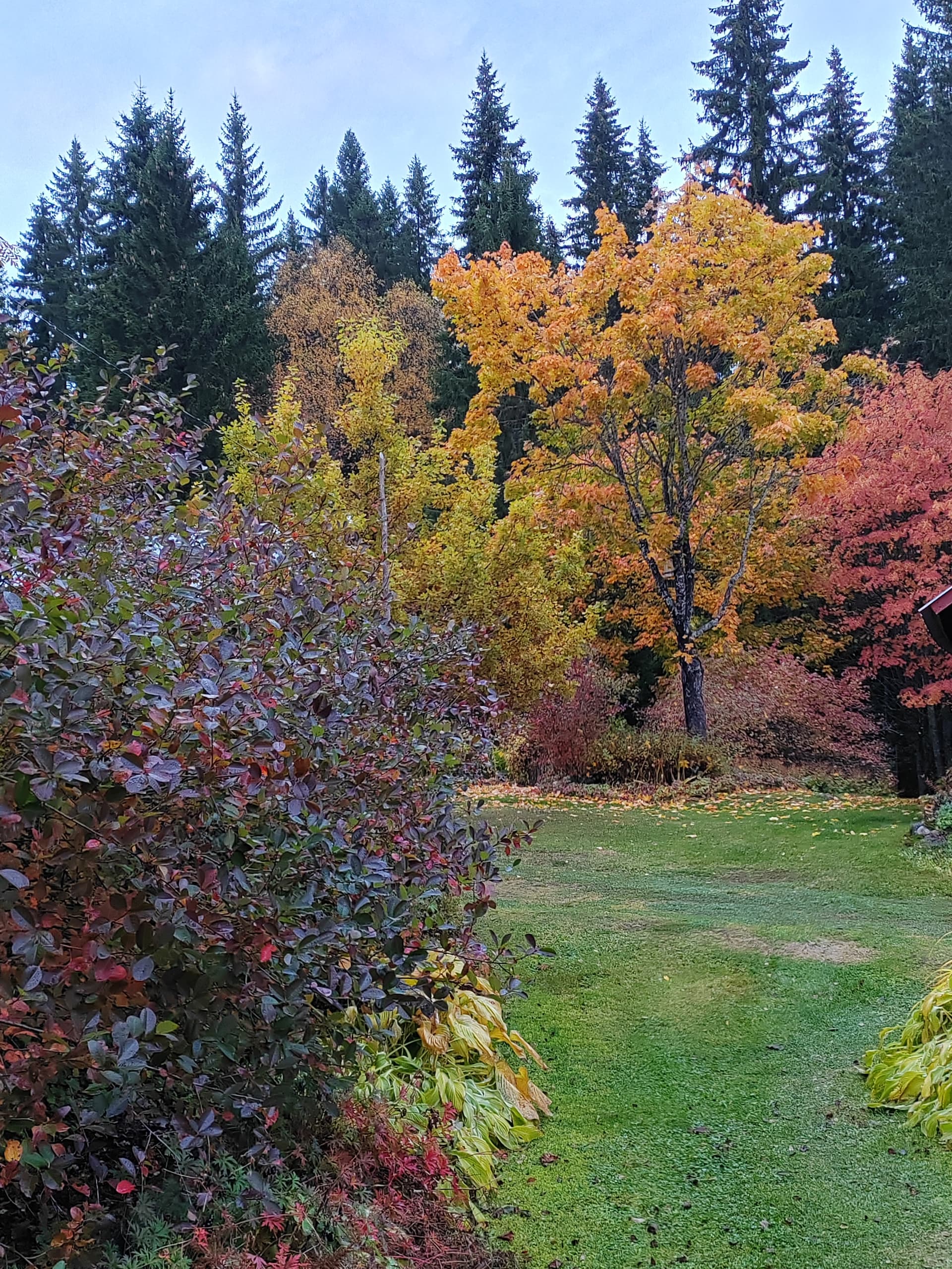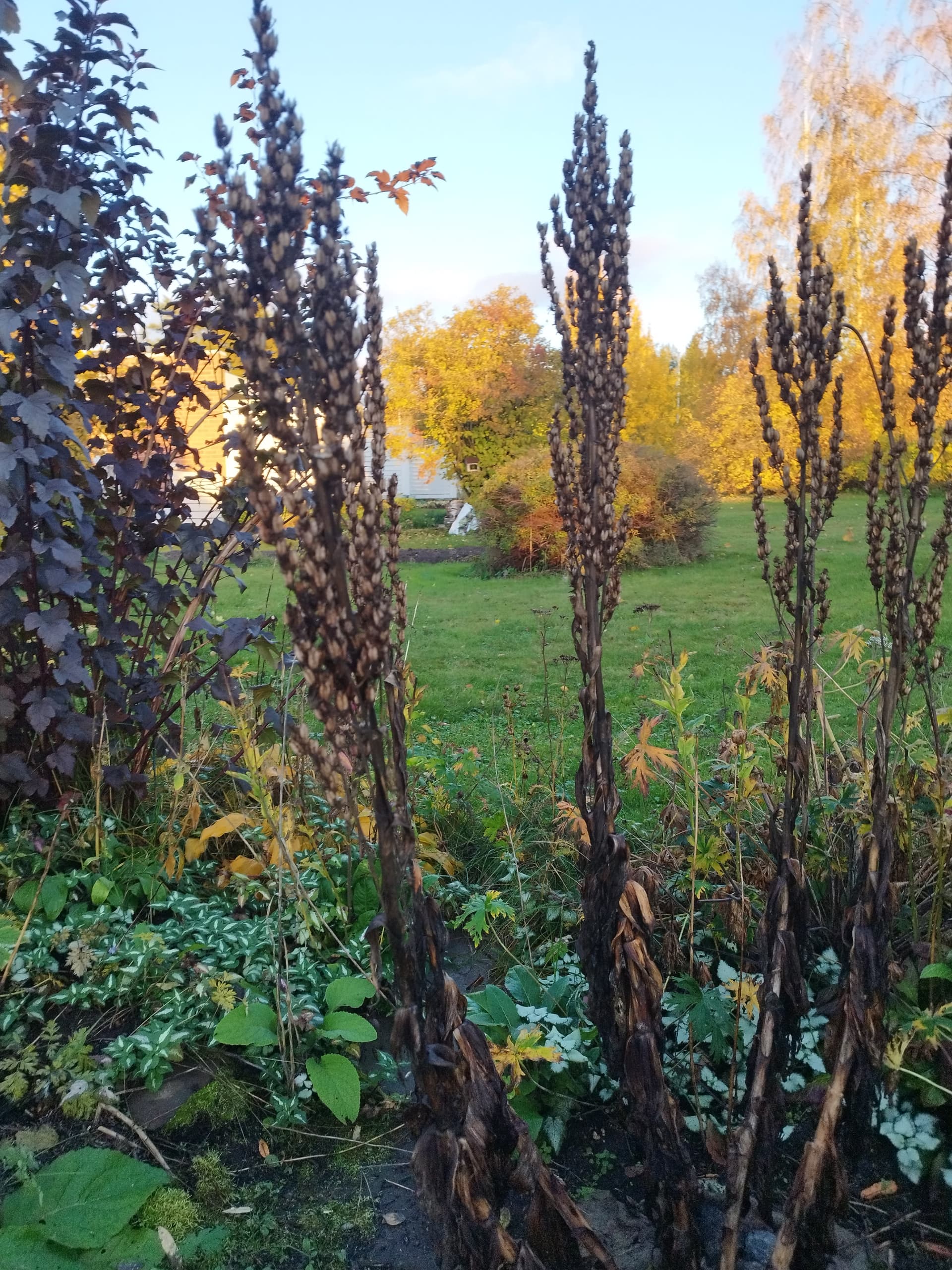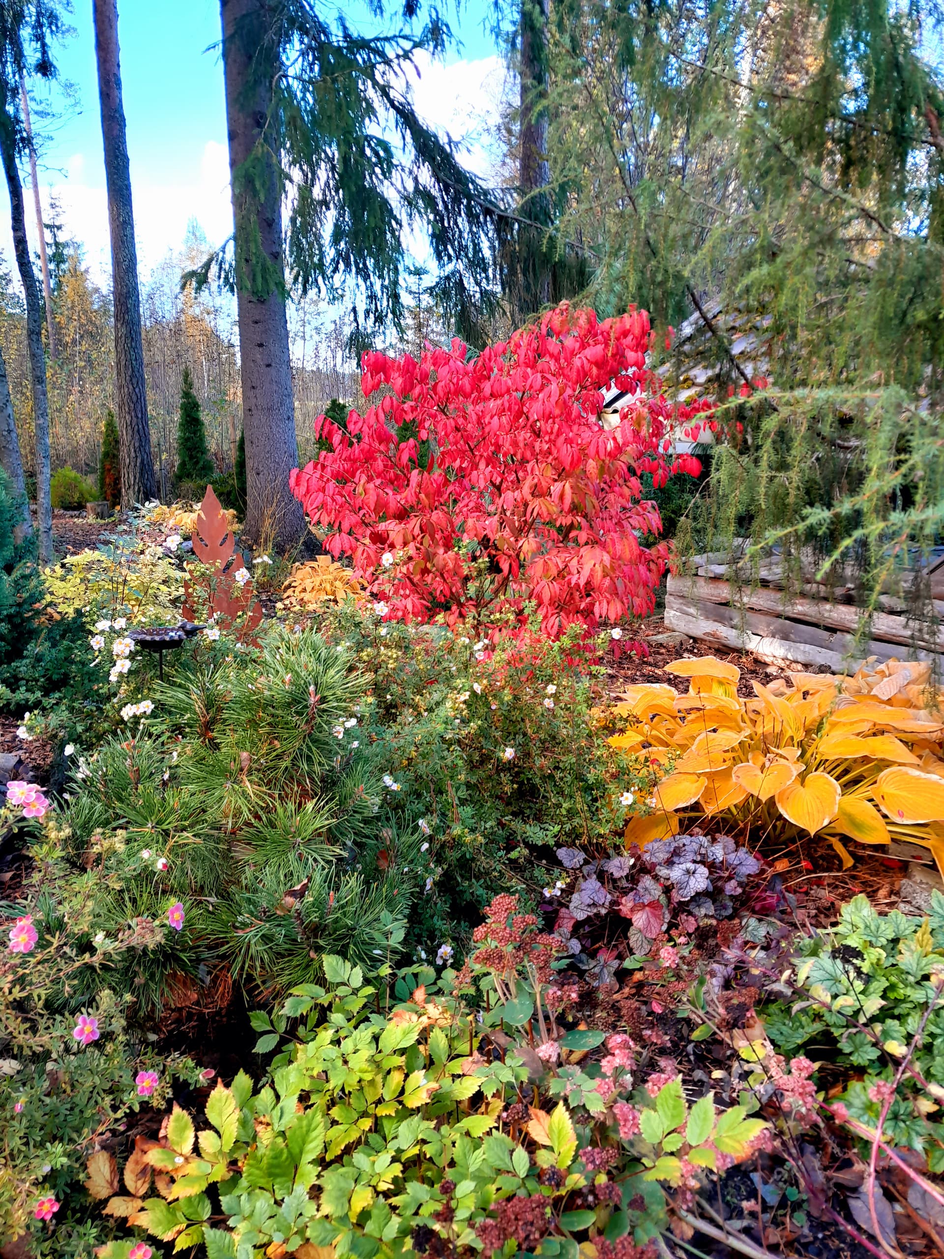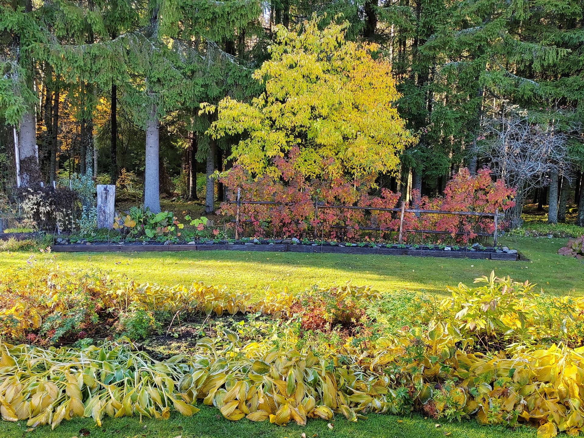 Toisaalla metsän rajalla koristearonia ruskavärissään ja kuunliljat kullankeltaisia.