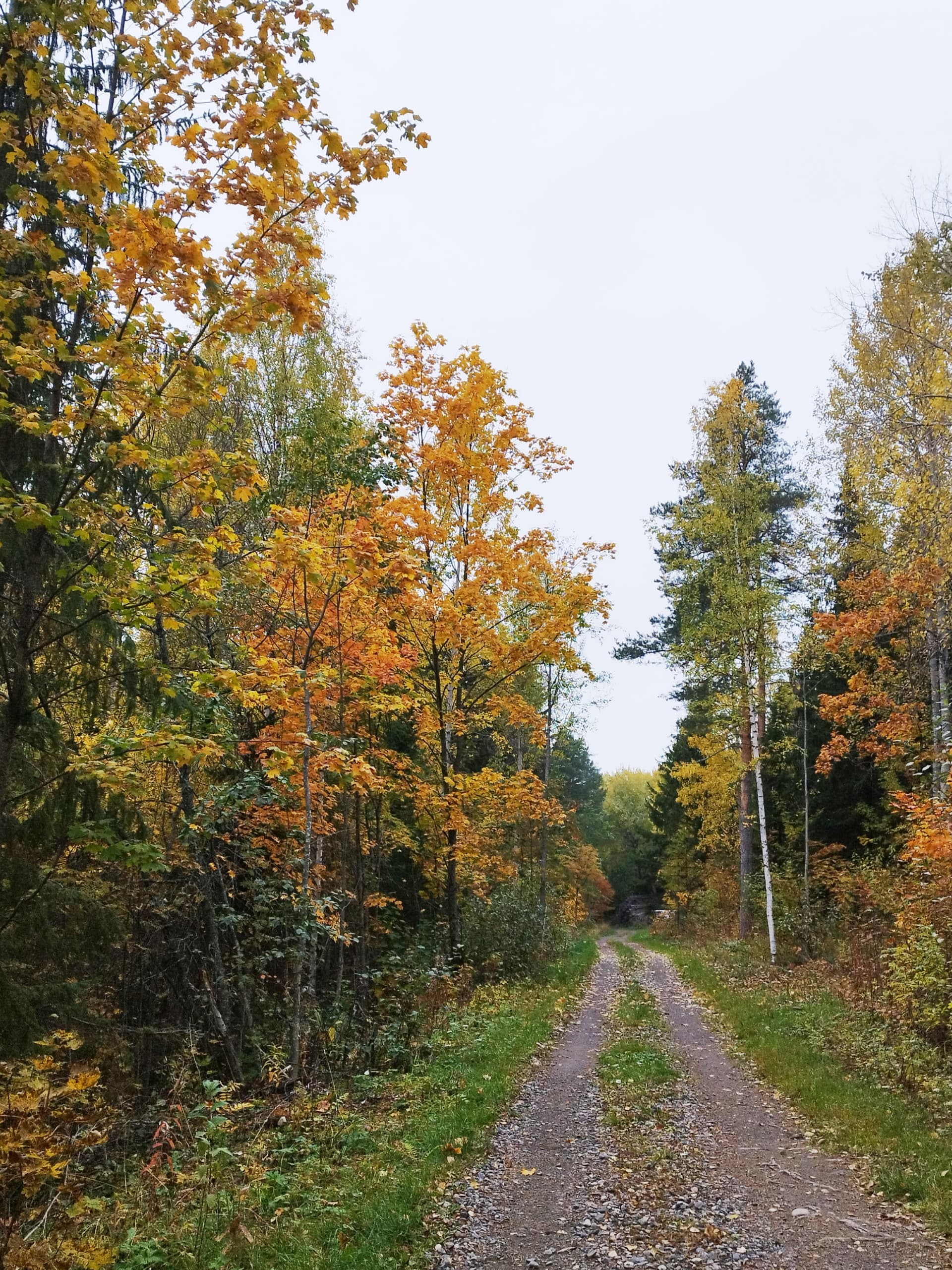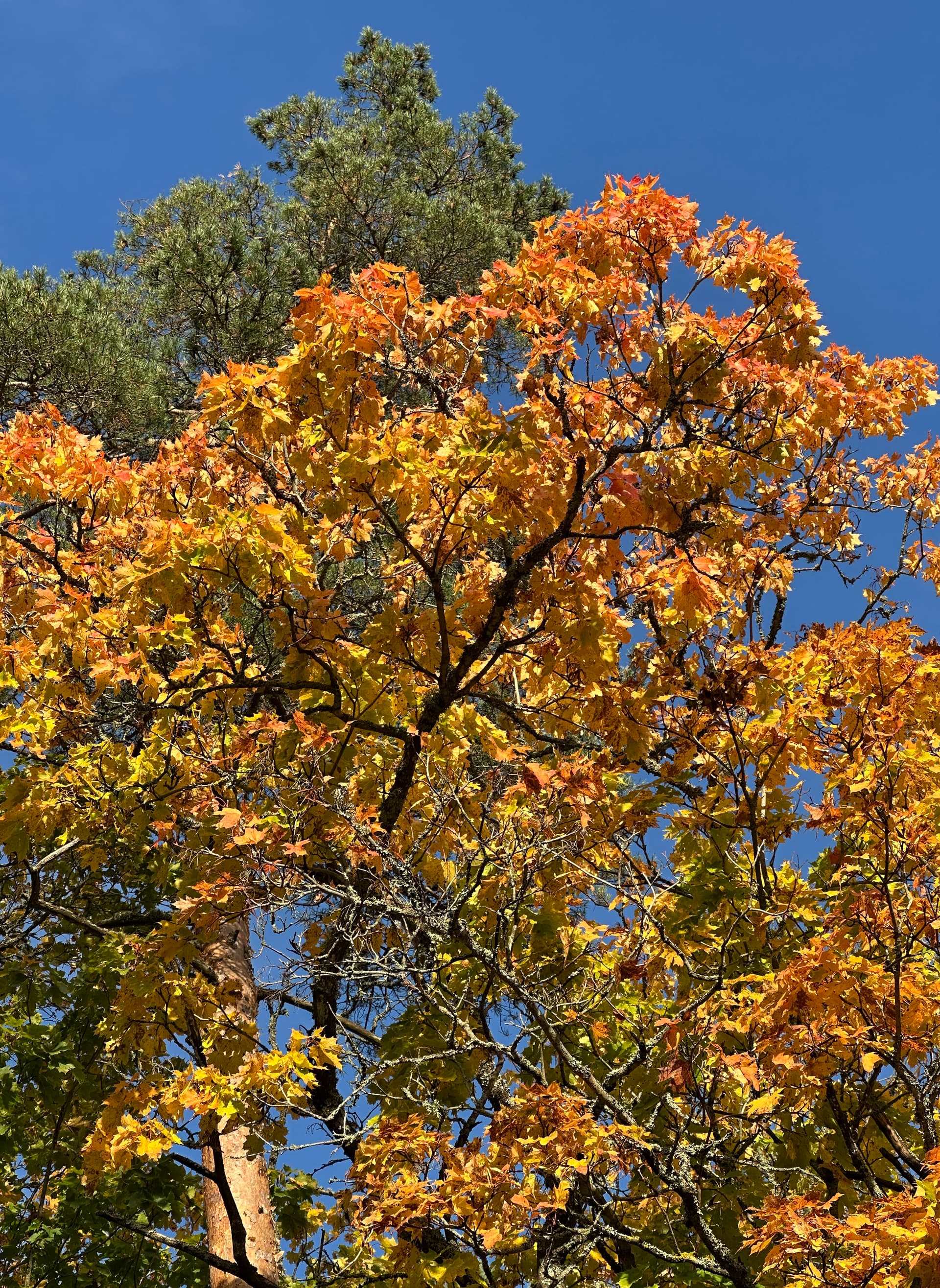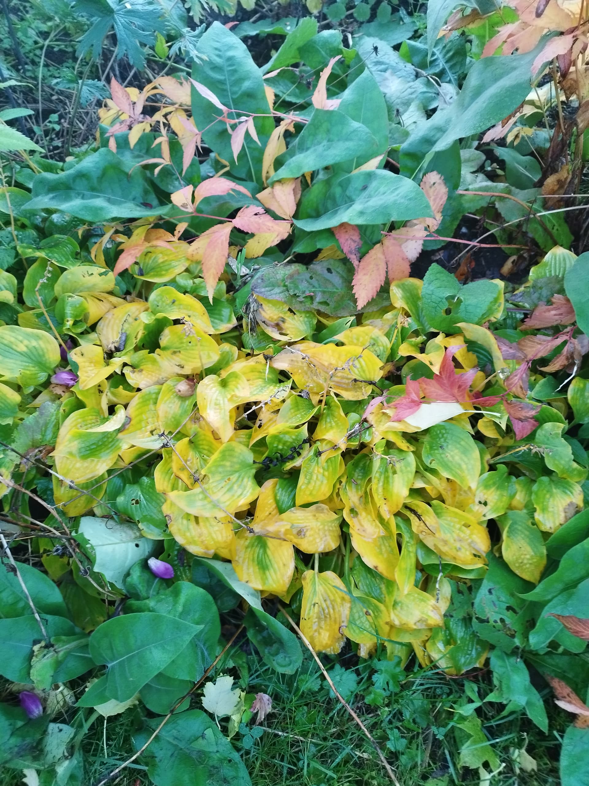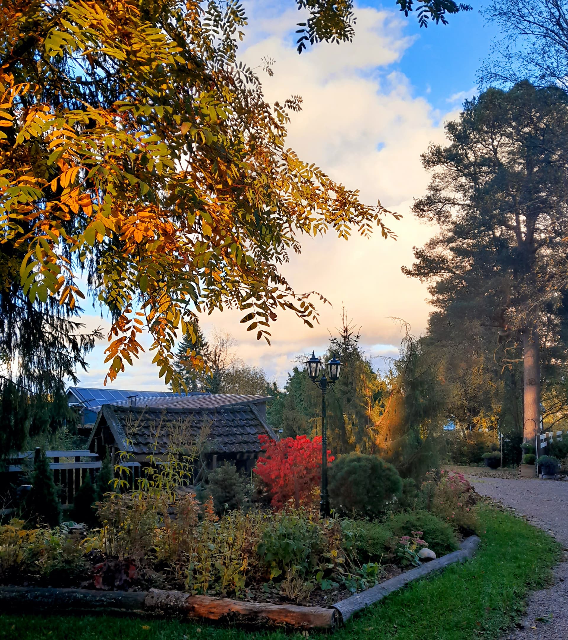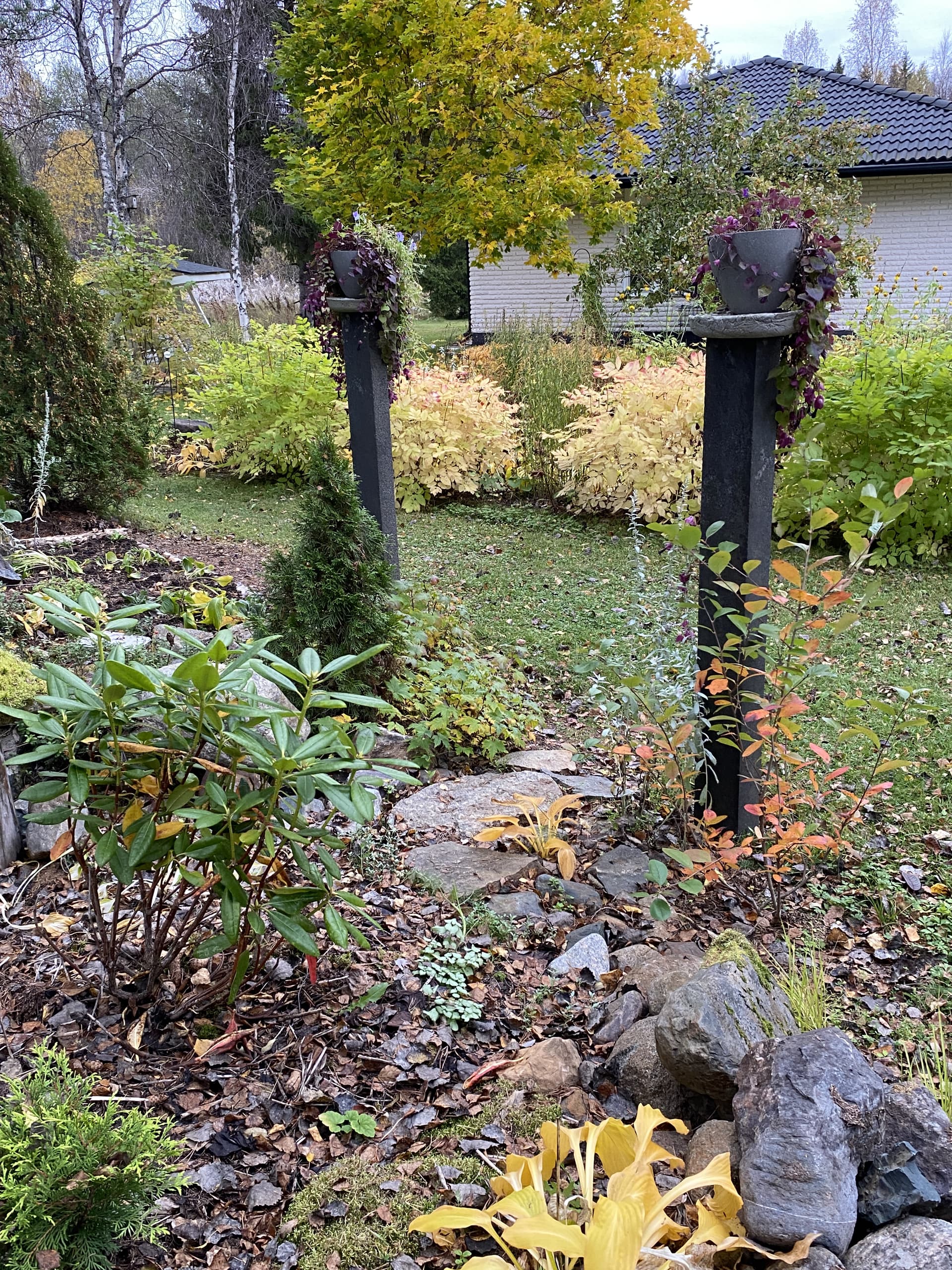 Toisaalla metsän rajalla koristearonia ruskavärissään ja kuunliljat kullankeltaisia.