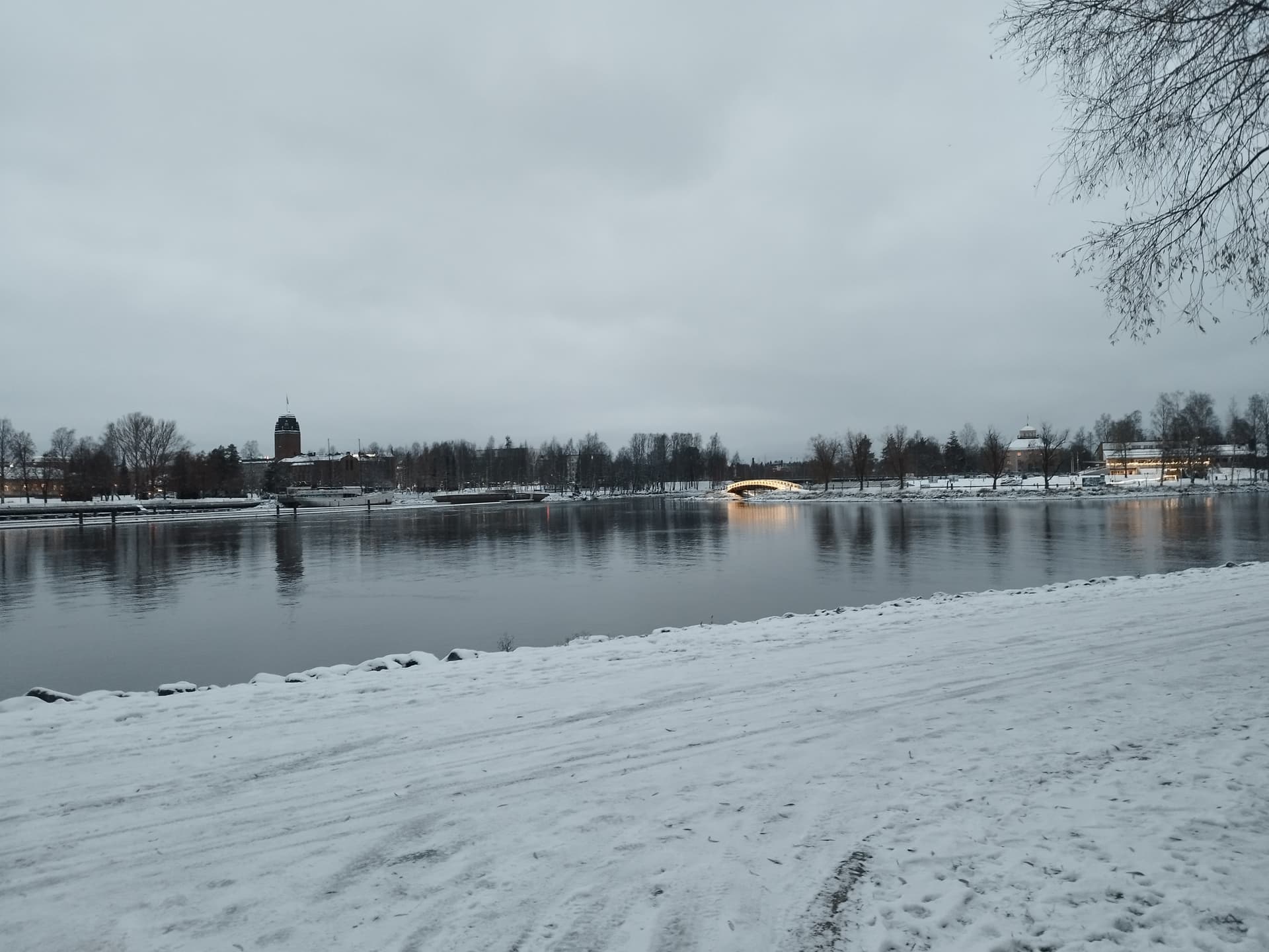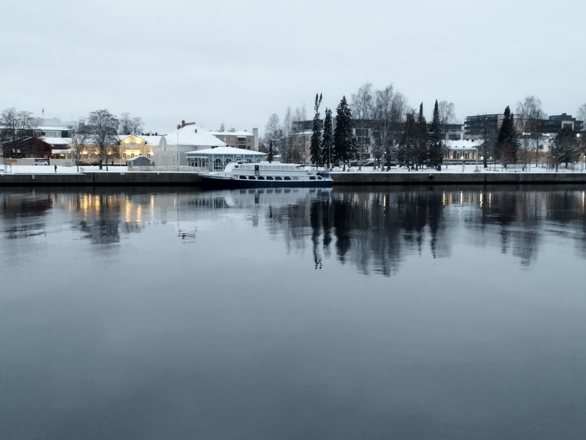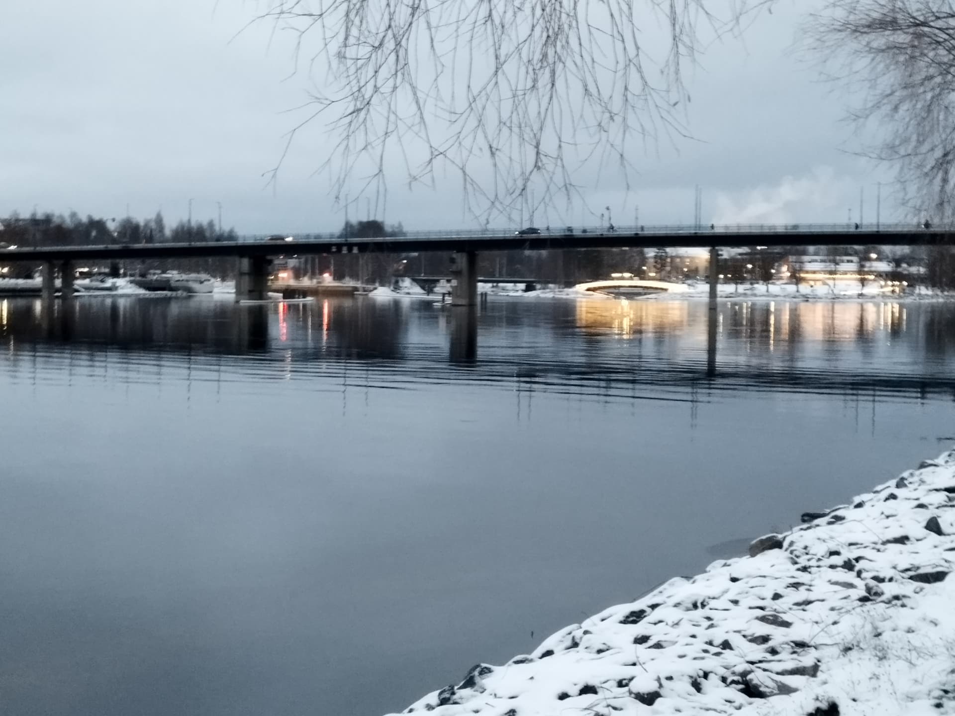 Tänään näin ensimmäisen koiranulkoiluttajan kadulla potkurin kanssa. Lunta on 3 cm. Julistan talvikauden alkaneeksi. Tyyntä -6, joen virtaus on heikkoa vaikka kosket näkyy.
